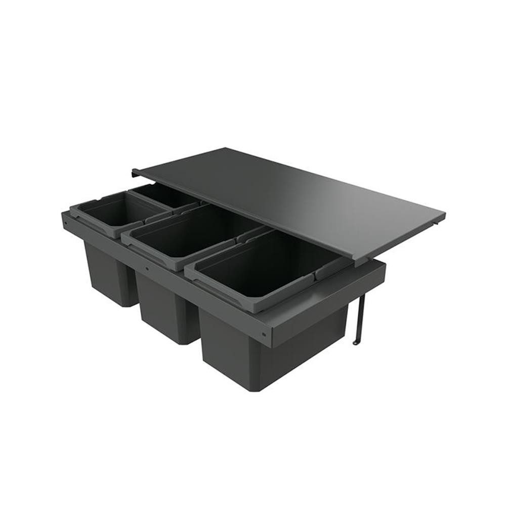 einem fest eingebauten Gesamtdeckel ausgestattet, der unangenehme Gerüche vermeidet. Befestigt wird das Müll-trennungssystem mithilfe einer Schraubmontage auf dem Boden des Schubfachs.