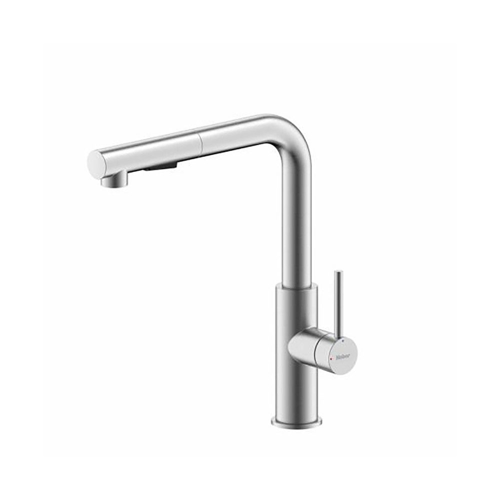 seitlich angebrachte Mischer harmonisch in das Erscheinungsbild einfügt. Dank des ausziehbaren Auslaufs sowie der Umstellmöglichkeit zwischen Strahl und Brause bietet die Armatur einen deutlichen Mehrwert gegenüber herkömmlichen Armaturen. Der integrierte Laminarstrahlregler bietet weiteren Mehrnutzen.