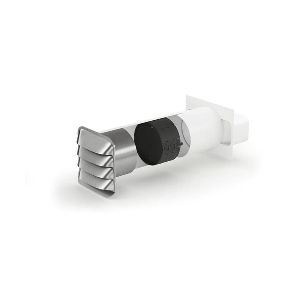 Mauerkasten mit Teleskoprohr, inkl. eingebautem Wärmerückhaltesystem THERMOBOX und Edelstahl-Außenjalousie E-Jal Col®. Leitkörper an den Lamellen der Jalousie sorgen für eine optimierte Strömungsführung.