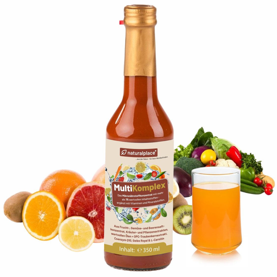 MultiKomplex enthält über 75 hochwertige Inhaltsstoffe wie Obst, Gemüse, Beeren, Kräuter, Gewürze, wertvolle Öle, ergänzt mit Vitaminen und Mineralstoffen. Damit erhalten Sie die ideale Ergänzung zu einen schwungvollen Tag!