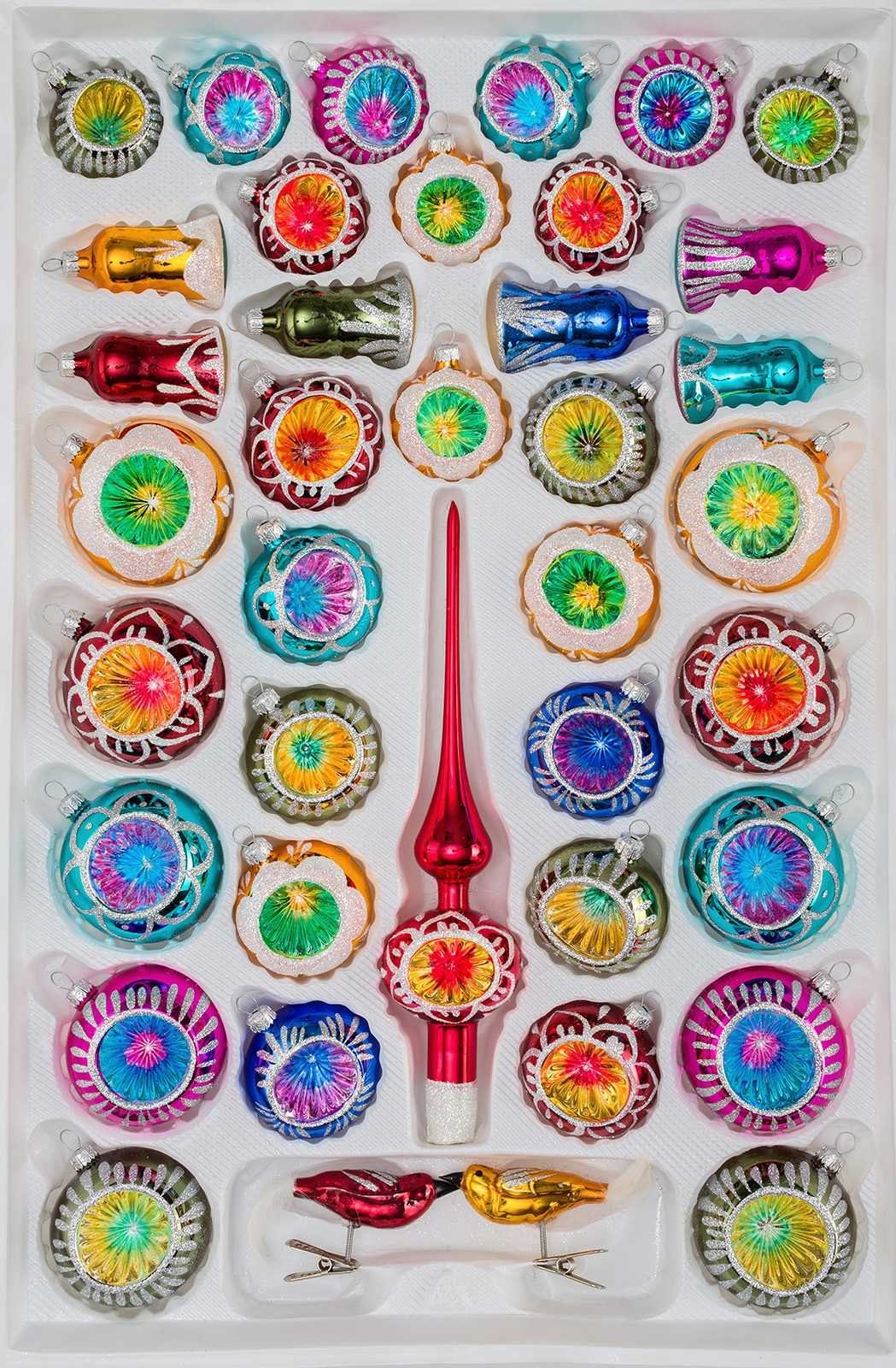 39 tlg. Weihnachtskugeln Set in "Hochglanz Vintage Style" Der absolute Klassiker zu Weihnachten. Jede einzelne Kugel wurde mit viel Mühe und Geduld von Hand gefertigt. Mundgeblasen und edel verziert. Das gesamte Dekor kann man nicht in Worte fassen. Schauen Sie sich einfach die Bilder an und tauchen Sie in einem wunderschönen Weihnachtsflair ein. Wir haben noch weiteren Weihnachtsbaumschmuck in dem das selbe Dekor enthalten ist oder stellen Sie sich doch einfach was schönes zusammen. Der Durchmesser der einzelnen Kugeln beträgt ca. 4-8cm Zu diesem Set haben wir auch passende Glas-Vögel mit echten Federn, Glas Zapfen & 12tlg. Set´s Bestellen Sie doch gleich die Weihnachtskugel-Haken mit!