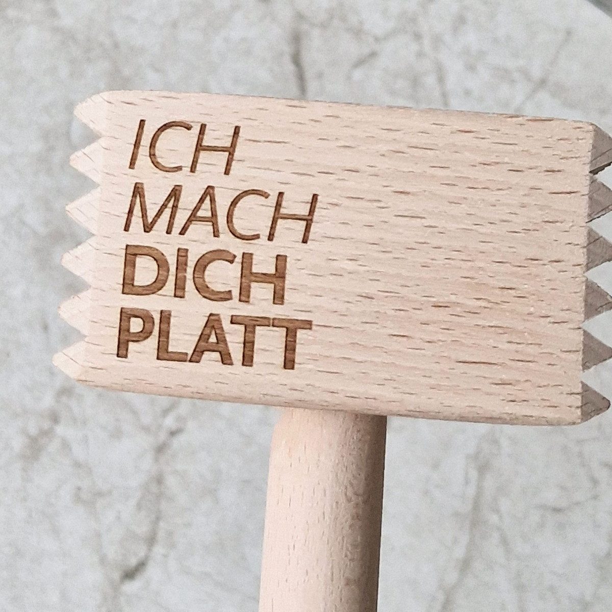 Fleischklopfer „ICH MACH DICH PLATT“ Hier trifft Humor auf pure Power! Mit diesem Fleischklopfer aus massivem Buchenholz sagst Du zähem Fleisch den Kampf an – und das mit einem breiten Grinsen im Gesicht. Die markante Gravur „ICH MACH DICH PLATT“ lässt keinen Zweifel an seiner Mission: Steaks, Schnitzel und Koteletts perfekt in Form zu bringen. Gefertigt aus hochwertigem, nachhaltigem Buchenholz, überzeugt dieser Küchenhelfer durch außergewöhnliche Robustheit und eine lange Lebensdauer. Mit seinen 29 cm Länge und dem ergonomisch geformten Griff liegt er sicher und angenehm in der Hand. So kannst Du selbst dickere Fleischstücke mühelos bearbeiten – effizient, gleichmäßig und ohne die Fleischfasern zu beschädigen. Dieser Fleischklopfer ist ein echtes Multitalent in der Küche - egal ob für zartes Schnitzel, saftige Steaks oder plattiertes Geflügel. Und dank seiner humorvollen Botschaft eignet er sich nicht nur für den Eigengebrauch, sondern auch perfekt als originelles Geschenk für Hobbyköche, Grillfans oder alle, die in der Küche gerne klare Ansagen machen. Highlights: Maße: 29 x 8,5 x 4,5 cm – optimal für präzises Arbeiten Nachhaltiges Buchenholz – robust, langlebig und natürlich schön Witzige Gravur – sorgt für Gesprächsstoff und gute Laune beim Kochen