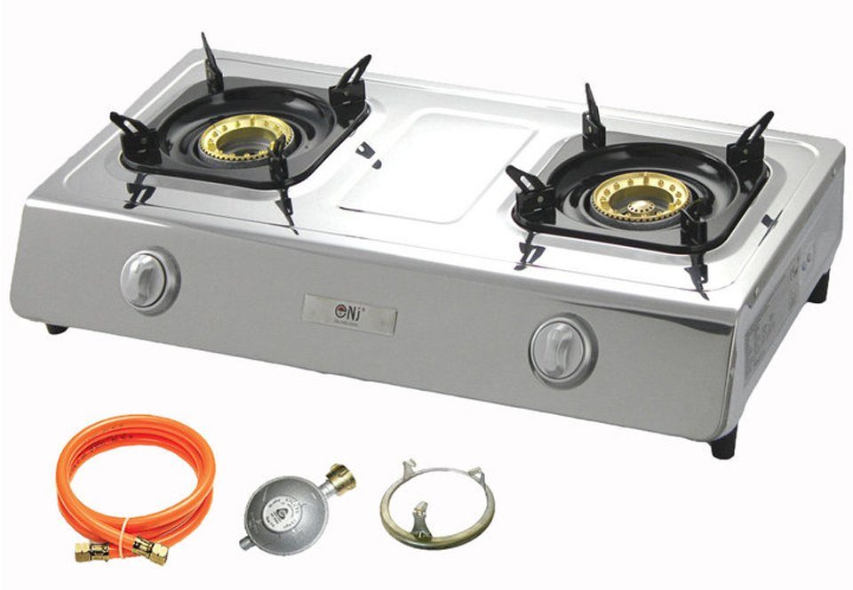 NSD-2 Edelstahl Gaskocher 2 flammig Campingkocher mit Zündsicherung inkl. Gasschlauch-Regler Set 80cm/50mbar