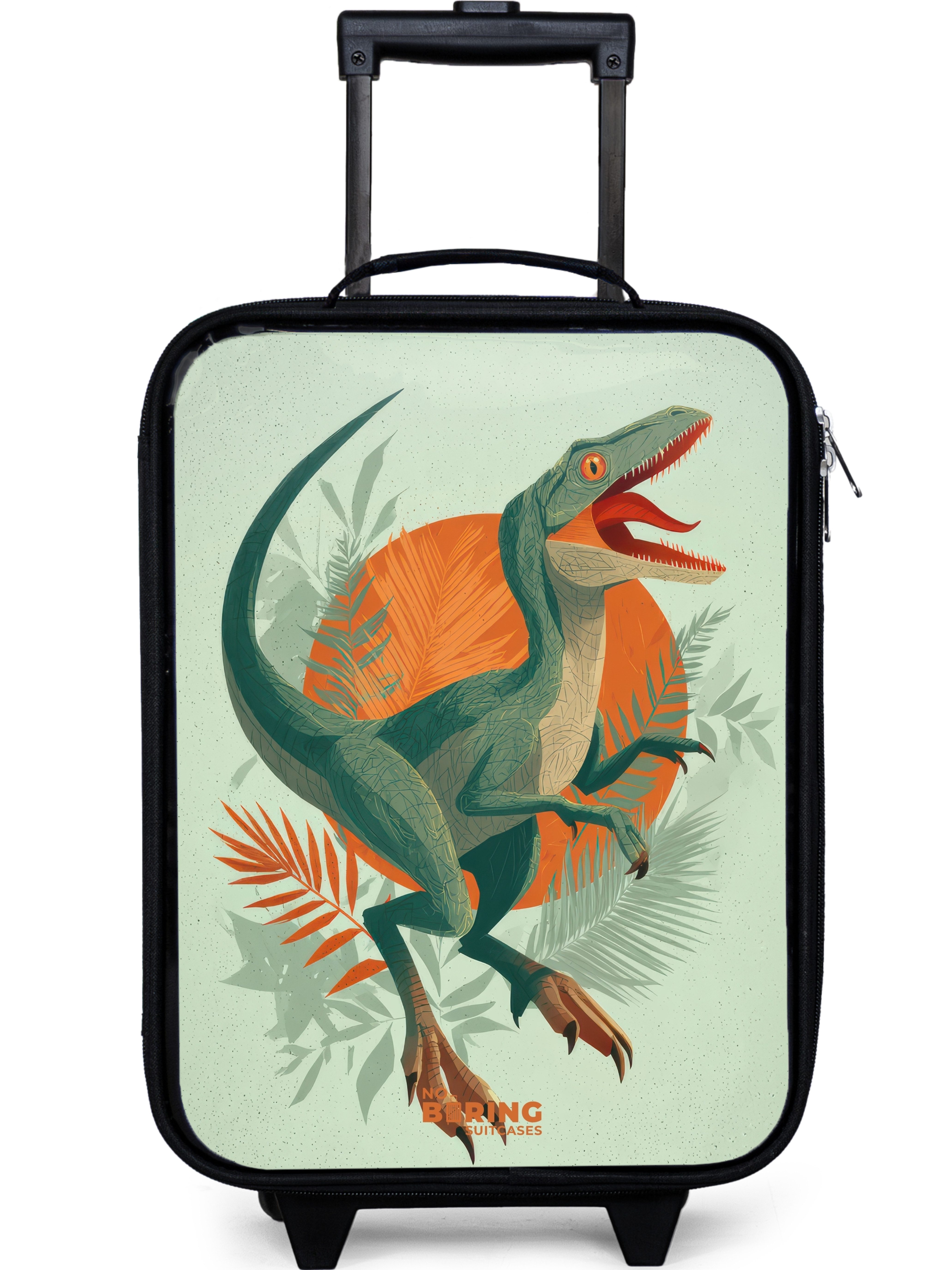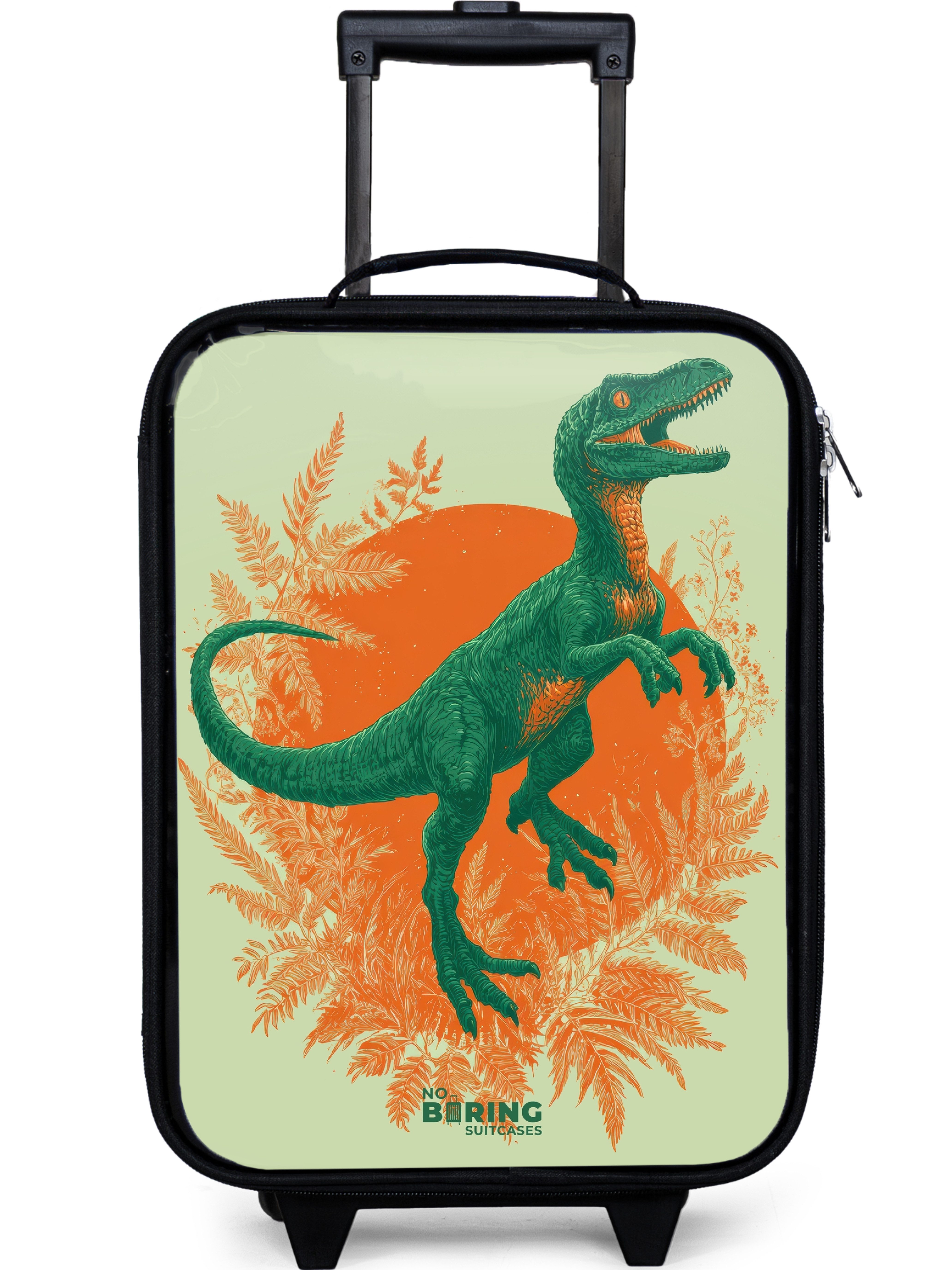 Ein Velociraptor mit scharfen Krallen und geöffnetem Maul bewegt sich anmutig vor einem großen orangefarbenen Kreis, der von tropischen Blättern in Grautönen umgeben ist. Seine Haut ist mit geometrischen Linien in Grüntönen gezeichnet.