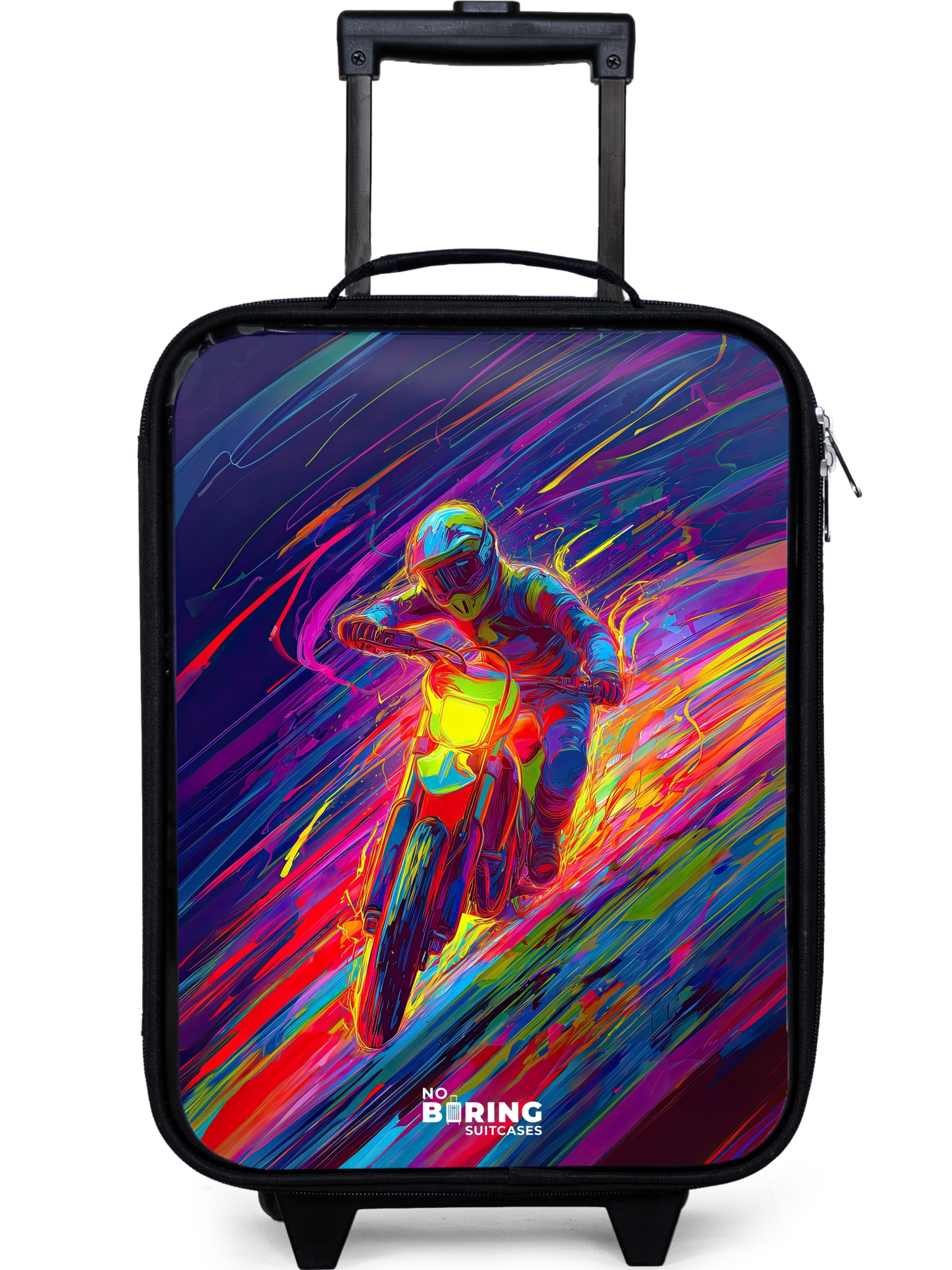 Ein knallharter Motocross-Fahrer fliegt mit voller Geschwindigkeit direkt auf den Betrachter zu, umhüllt von einer bunten Explosion von Neonfarben. Der Hintergrund ist ein dynamisches Spiel aus fließenden Linien in leuchtendem Pink, Gelb, Blau und Lila, das Geschwindigkeit und Bewegung ausstrahlt. Der Fahrer trägt einen Helm und eine Schutzkleidung, die perfekt zu der energiegeladenen Farbpalette passt.