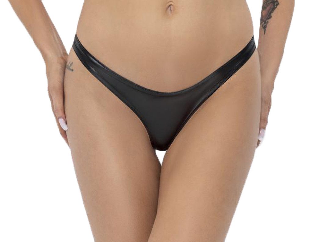 Schwarzer Klassischer Wetlook String in matter Optik. Der Artikel ist in einer Hochglanzbox verpackt.