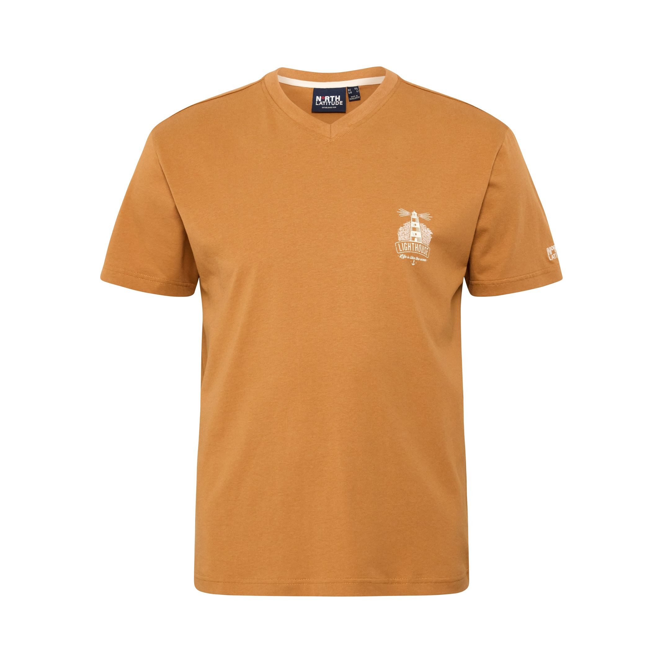 Modern, schlicht und mit maritimem Akzent: Dieses V-Neck T-Shirt von North in Camel begeistert mit seinem kleinen Brustprint – einem stilisierten Leuchtturm-Motiv in Weiß. Durch den V-Ausschnitt erhält das Shirt einen sportlich-eleganten Touch, der es vielseitig kombinierbar macht – von lässigen Freizeitlooks bis hin zu entspannten Sommer-Outfits.