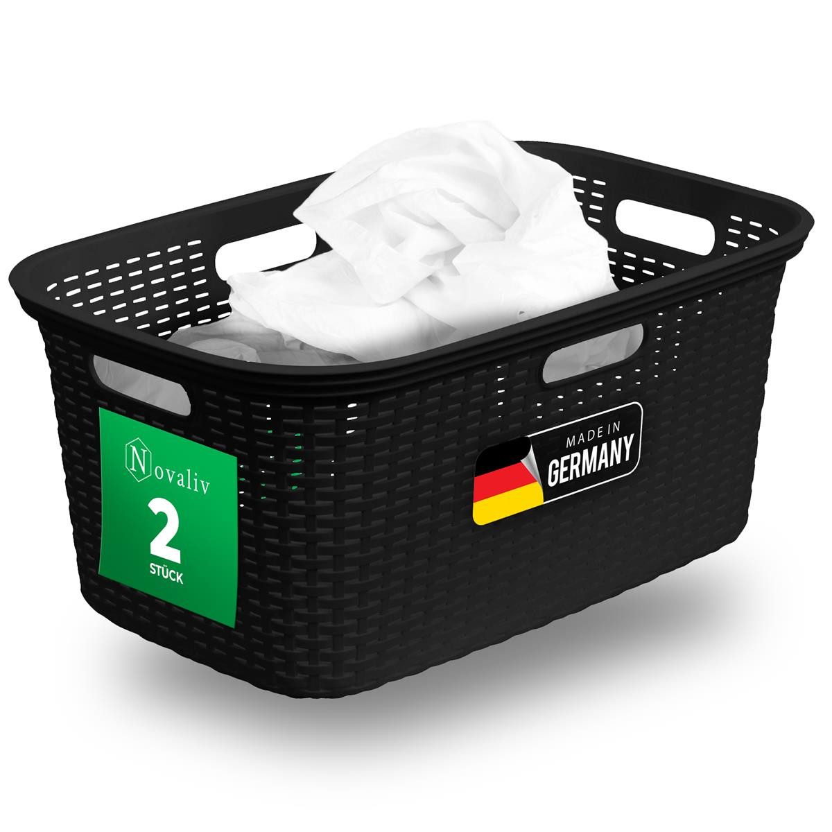 Der Novaliv Wäschekorb in stilvoller Rattanoptik ist eine praktische und elegante Lösung für die Aufbewahrung Ihrer Wäsche. Die vier stabilen Griffe bieten verschiedene Trageoptionen, sodass der Korb komfortabel mit einer oder zwei Händen transportiert werden kann, auch ideal für schwere Lasten. Mit einer hohen Tragkraft von 25 kg hält der Korb dank seiner robusten Konstruktion selbst großen Belastungen stand und garantiert Langlebigkeit. Das großzügige Fassungsvermögen von 40 Litern macht ihn besonders für große Haushalte geeignet, da weniger häufiges Tragen notwendig ist. Highlights: Praktische Lösung für jedes Zuhause Stilvolle Rattanoptik 40L Fassungsvermögen Hochwertiger Kunststoff Made in Germany Vielseitig einsetzbar Hohe Tragkraft 4 Griffe Praktisch für jedes Zuhause Unser Wäschekorb hat die idealen Maße von 59x39x26 cm und bietet eine perfekte Lösung für alle, die viel Wäsche auf wenig Platz sammeln wollen. Das dezente, aber ansprechende Rattanmuster sorgt dafür, dass der Korb nicht nur funktional ist, sondern auch optisch ein Plus für Ihr Zuhause darstellt. Die 4 Griffe ermöglichen komfortables Tragen im ganzen Haus. Hochwertige Qualität Der Novaliv Wäschesammler besteht aus hochwertigem Kunststoff, welcher besonders robust und feuchtigkeitsbeständig ist. Das Material ist außerdem sehr pflegeleicht und lässt sich besonders einfach reinigen, ideal für den täglichen Gebrauch. Made in Germany Unser Wäschekorb ist in Deutschland gefertigt und steht für hohe Qualität, kurze Transportwege sowie für besondere Langlebigkeit. Dank der sorgfältigen Herstellung können Sie sich auf unser Produkt verlassen. Mit unserem Wäschesammler treffen Sie eine umweltbewusste Wahl, mit lokaler Produktion und Verwendung von hochwertigen Materialien.