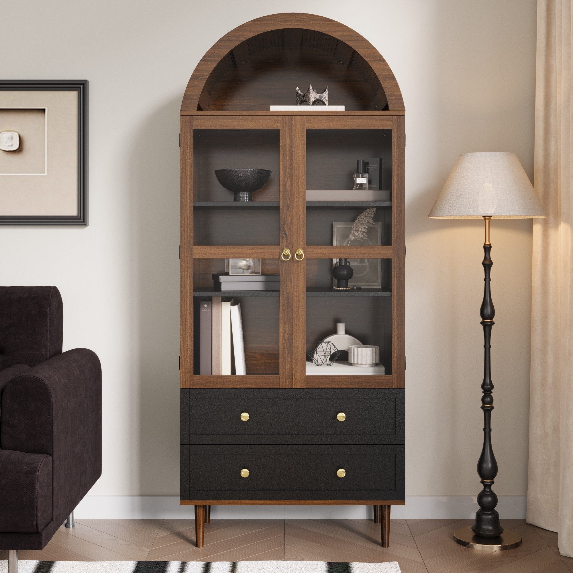 Das Sideboard wurde für flexible Nutzungsszenarien konzipiert. Hinter der geriffelten Glastür lassen sich ausgewählte Dekorstücke, Geschirr oder Gläser ansprechend präsentieren, während verstellbare Einlegeböden freie Anpassung an unterschiedliche Gegenstände ermöglichen. Feine goldene Ringgriffe setzen dezente Akzente und unterstreichen das elegante Erscheinungsbild.