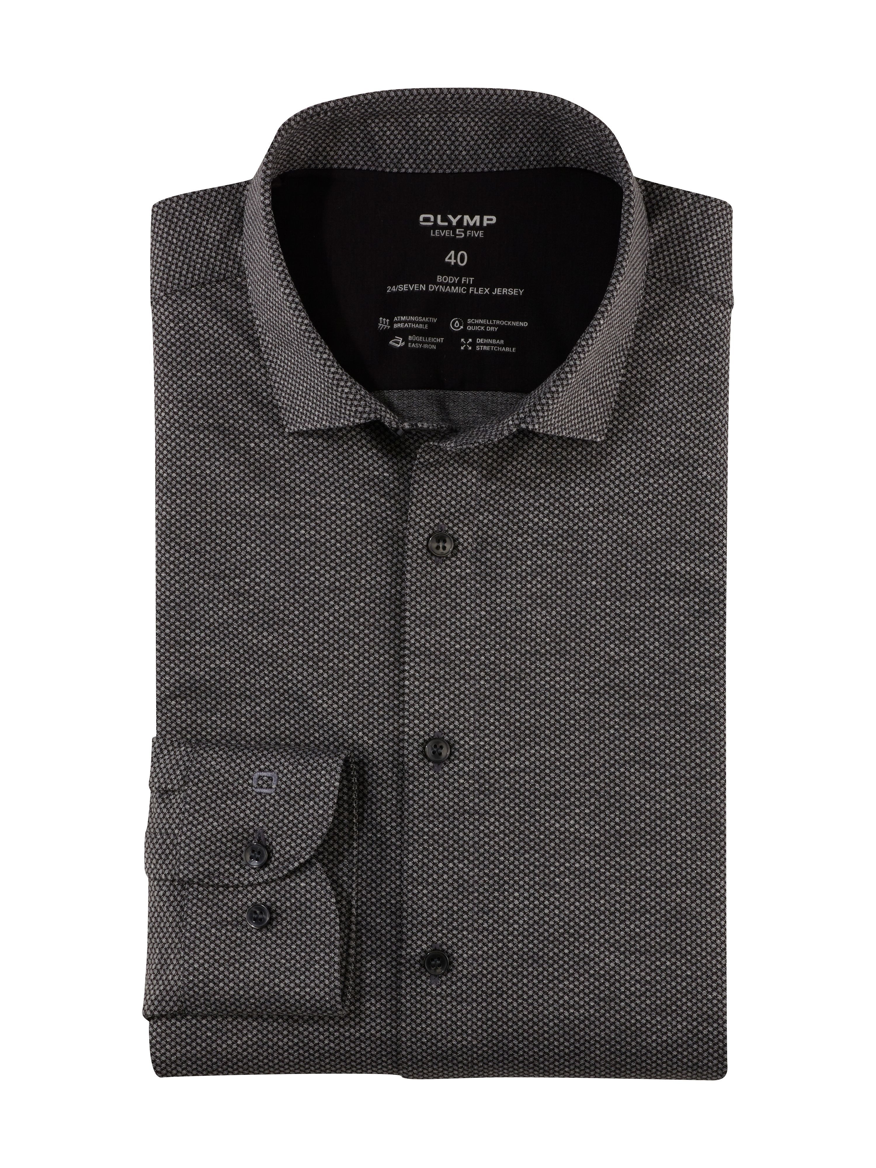 Mit seiner leichten, hoch elastischen und atmungsaktiven Jersey-Qualität ist dieses OLYMP Level Five 24/Seven ein perfekter Businesspartner für eine junge agile Zielgruppe. Der classy Faux-Uni-Look in edlem Anthrazit vermittelt Seriosität und Modernität, in klarer Linienführung, ohne Brusttasche und mit Modern-Kent-Kragen. Zeitsparend bügelleicht.