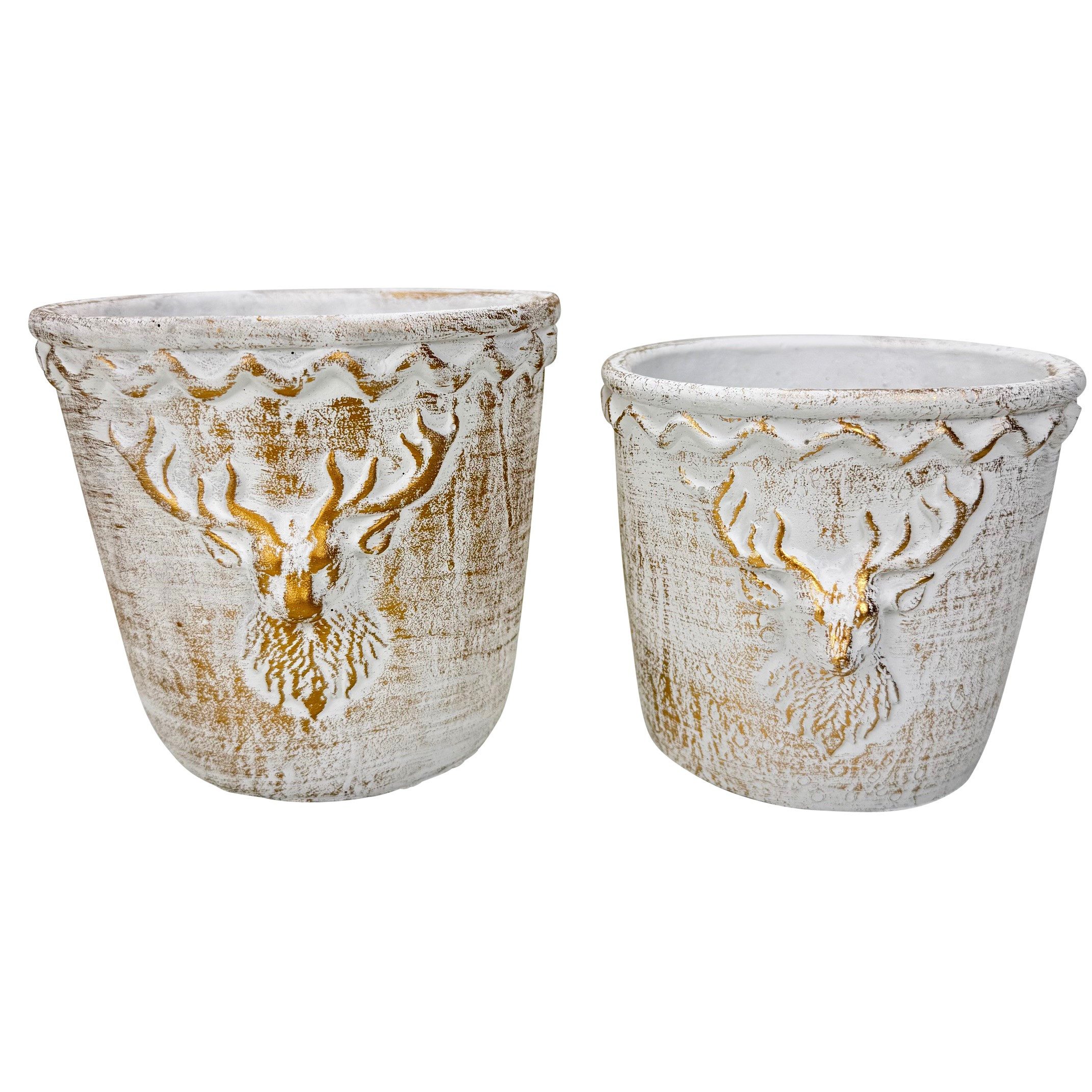2 edle Blumentöpfe mit einem Hirschkopf im 3D-Look und goldenen Applikationen im Vintage-Stil.