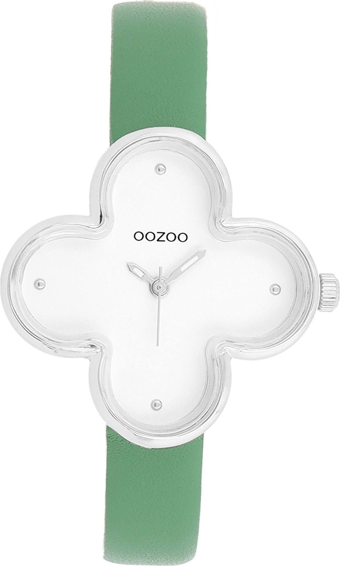 Die Fashion Uhr der Marke Oozoo hat ein schönes Armband aus Leder in grün mit Dornschließe. Eine Uhr aus der Oozoo Timepieces Kollektion für Damen in der Gehäusefarbe silber mit Quarzwerk. Die Analoguhr mit Mineralglas hat ein Zifferblatt in der Farbe weiß. Die Form der Uhr ist kleeform und das Gehäuse ist mittel ca. 32x32mm.