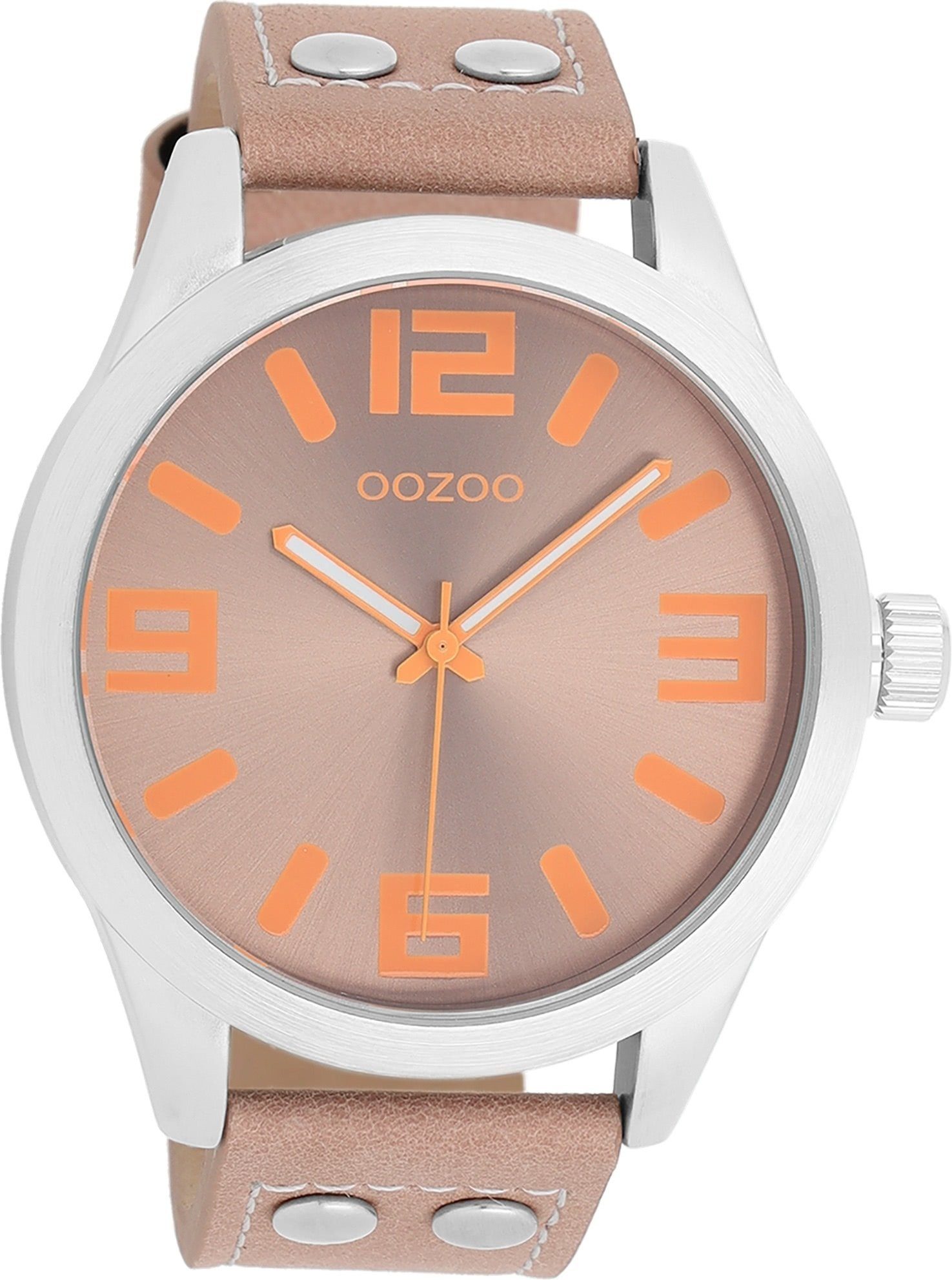 Die Fashion Uhr der Marke Oozoo hat ein schönes Armband aus Leder in rosa mit Dornschließe. Eine Uhr aus der Oozoo Timepieces Kollektion für Damen in der Gehäusefarbe silber mit Quarzwerk. Die Analoguhr mit Mineralglas hat ein Zifferblatt in der Farbe rosa. Die Form der Uhr ist rund und das Gehäuse ist extra groß ca. 46mm.