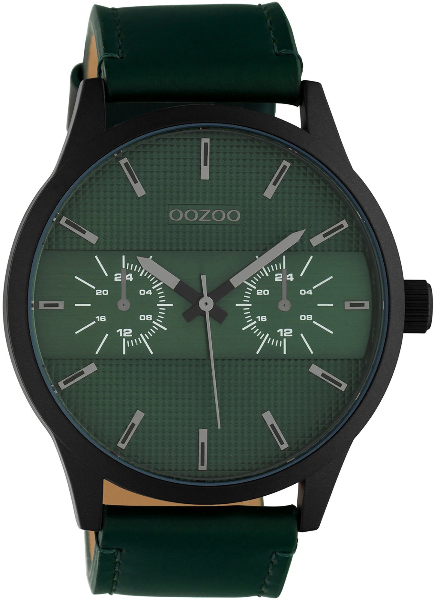 Die Fashion Uhr der Marke Oozoo hat ein schönes Armband aus Leder in grün mit Dornschließe. Eine Uhr aus der Oozoo Timepieces Kollektion für Herren in der Gehäusefarbe schwarz mit Quarzwerk. Die Analoguhr mit Mineralglas hat ein Zifferblatt in der Farbe grün. Die Form der Uhr ist rund und das Gehäuse ist extra groß ca. 48mm.