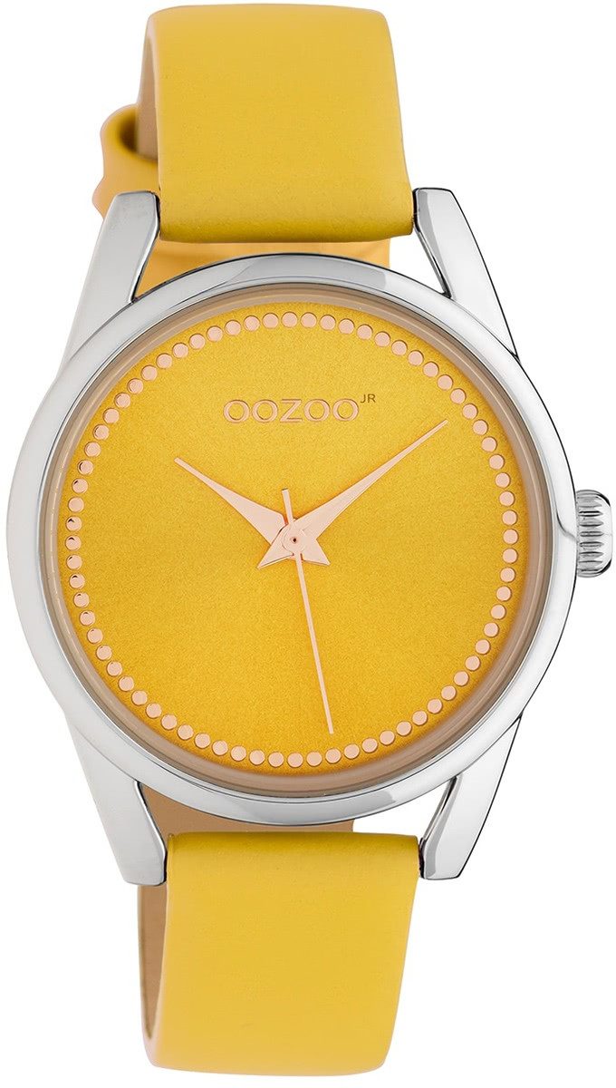 Die Fashion Uhr der Marke Oozoo hat ein schönes Armband aus Leder in gelb mit Dornschließe. Eine Uhr aus der Oozoo JR Kollektion für Kinder Jugend in der Gehäusefarbe silber mit Quarzwerk. Die Analoguhr mit Mineralglas hat ein Zifferblatt in der Farbe gold rosegold. Die Form der Uhr ist rund und das Gehäuse ist klein ca. 30mm.
