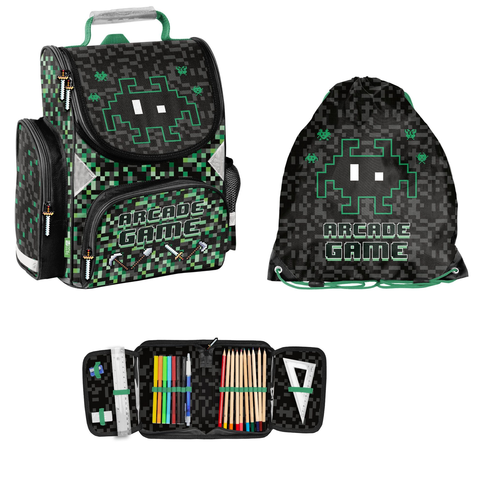 3-TEIILIGES SCHULSET: SCHULRUCKSACK + TURNBEUTEL + BEFÜLLTE FEDERMAPPE - GAME - SCHWARZ / GRÜN