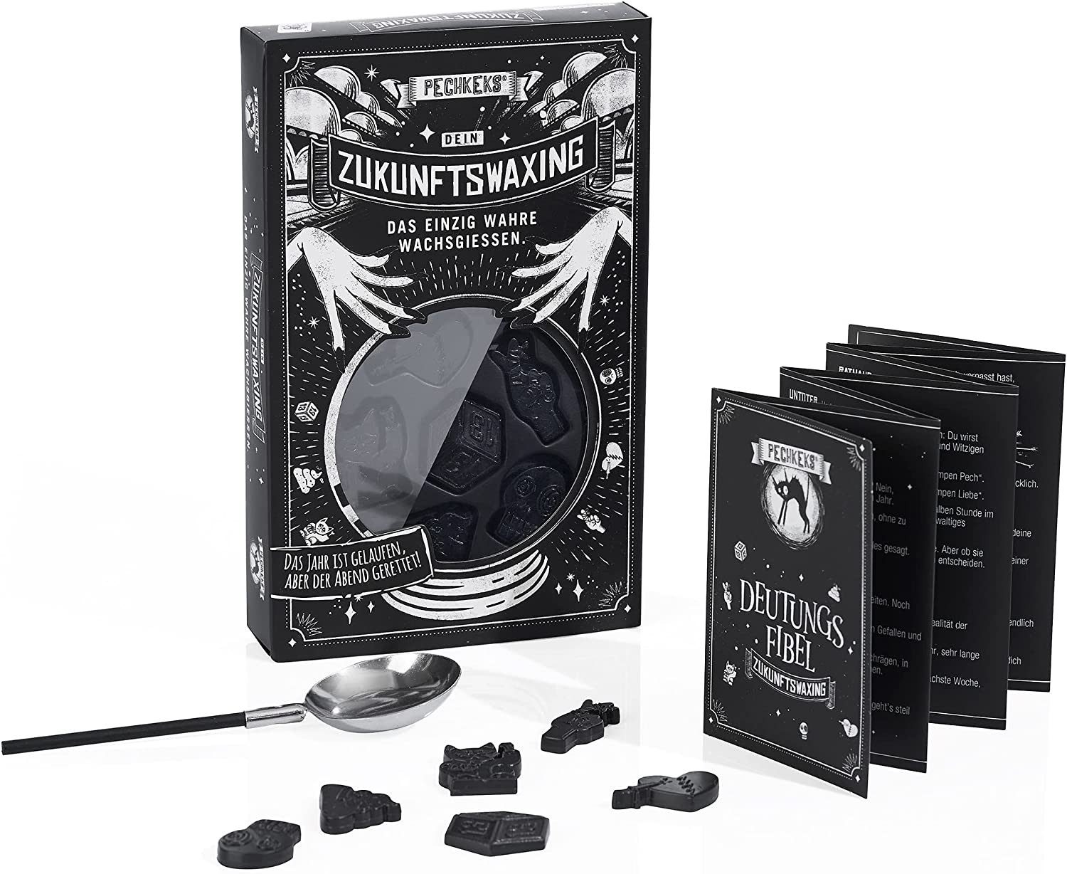 Wachsgiessen - Zukunfts Waxing Mach den Silvesterabend zum Roast Battle! Hol Dir das schaurig-schöne Wachsgießdesaster von Pechkeks und freu Dich auf sechs Chancen Deine Zukunft zu vermasseln. Wirf Dein Schicksal ins kalte Wasser - Du wirst es garantiert bereuen. Mit der herrlich schrecklichen Deutungsfibel und den schwarzen Pechwachsformen weißt Du genau, was Dich erwartet. Gut wird die Zukunft nicht, aber lustig! Das Pech. Jeder kennt es, jeder hat es, doch keiner weiß, wo er es findet. Nein, nicht unter einer ausgelatschten Bananenschale – sondern bei Pechkeks, der Zentrale des schwarzen Humors: Hier bekommt jeder die Packung seiner Wahl, egal ob zur makabren Selbstbelustigung, als herrlich fieses Mitbringsel oder schauriger Partykracher. So viel Spaß hat das Pech noch nie gemacht! Wir verwandeln das Ungemach in die besten Zoten und kleiden es in immer neue grandiose design Produkte mit sehr viel Liebe zum Detail. Hier wird jeder Pechvogel, jeder Unglücksrabe mit offenen Armen empfangen wie sonst nur von seinem Wohnzimmerkaktus. Und mit all den schönen Dingen ausgestattet, die er braucht, um sich seinem Schicksal auf unterhaltsamste Weise hinzugeben. Dabei sind wir noch lange nicht fertig mit der Welt, sondern stecken unsere Nase immer noch tiefer ins Schlamassel, um mit neuen schaurig schönen Produktideen zu überraschen. Dranbleiben lohnt sich!