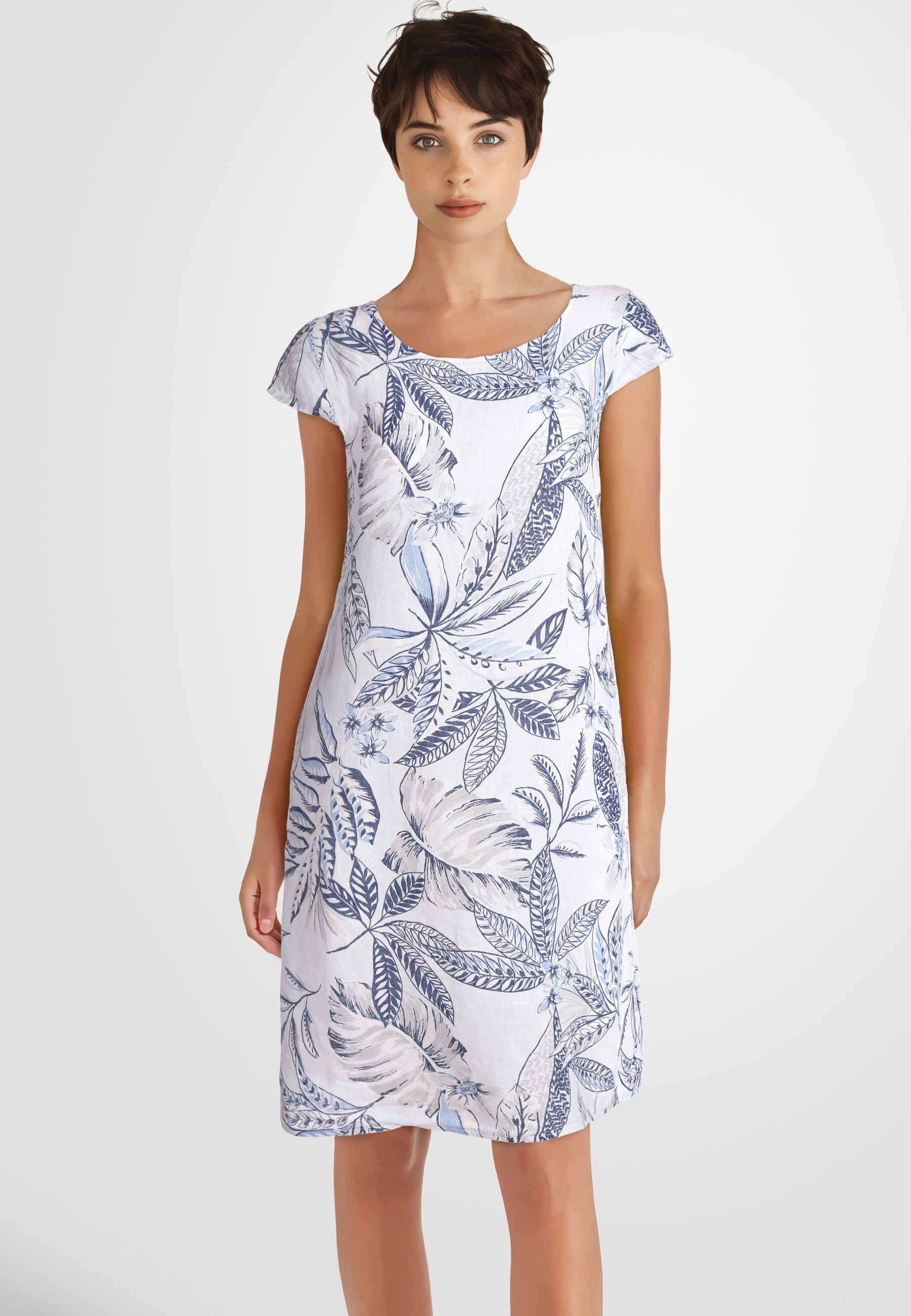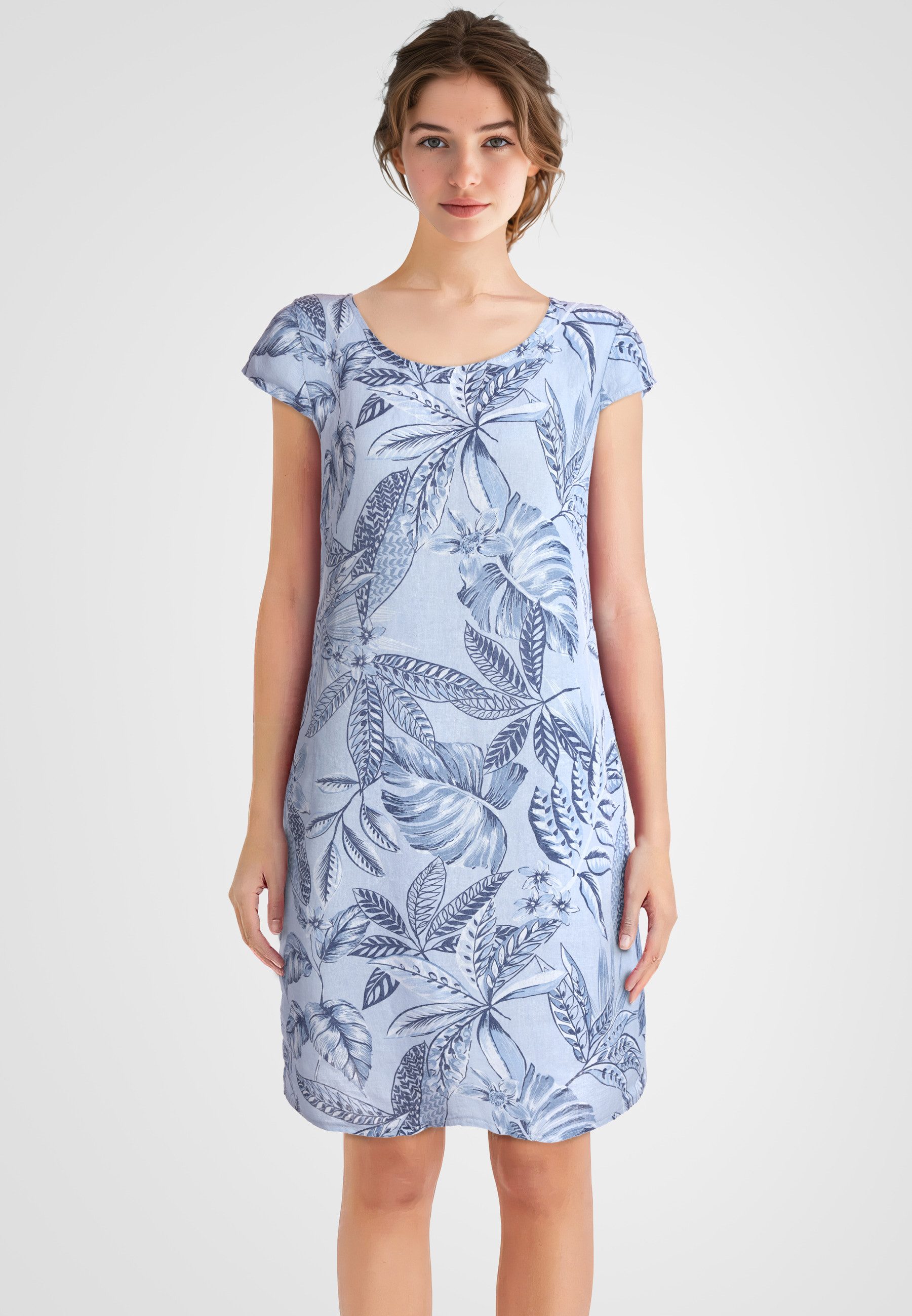 Sommerleicht und stilvoll - entdecke dieses bezaubernde Leinenkleid! Der lockere Schnitt und die leichte A-Form umspielen sanft deine Silhouette, während der florale Print für einen frischen, femininen Look sorgt. Die Cap-Ärmel und der klassische Rundhalsausschnitt verleihen dem Kleid eine zeitlose Note, die sich vielseitig stylen lässt.