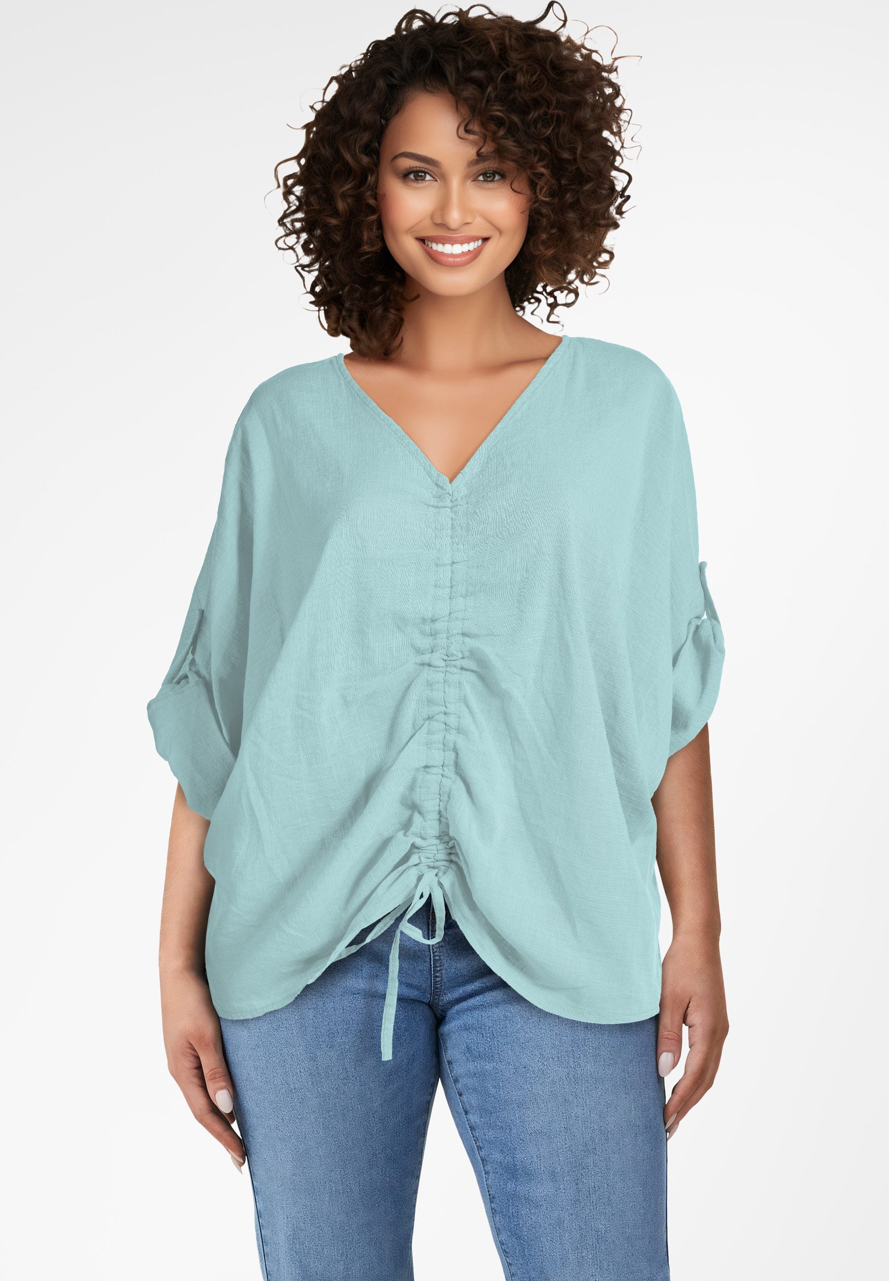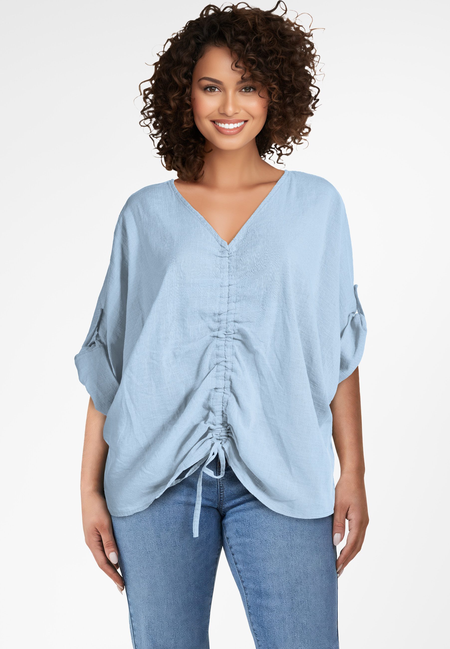 Lässige Bluse mit tiefem V-Ausschnitt, weitem Schnitt und 3/4-langen Turn-up-Fledermausärmeln. Vorne mittig mit Durchzugsband zum Raffen. Angenehmes Baumwollmischgewebe mit Leinenanteil und Leinenstruktur. Entdecke die Blusentunika, die deinen Alltag mit Stil und Komfort bereichert.