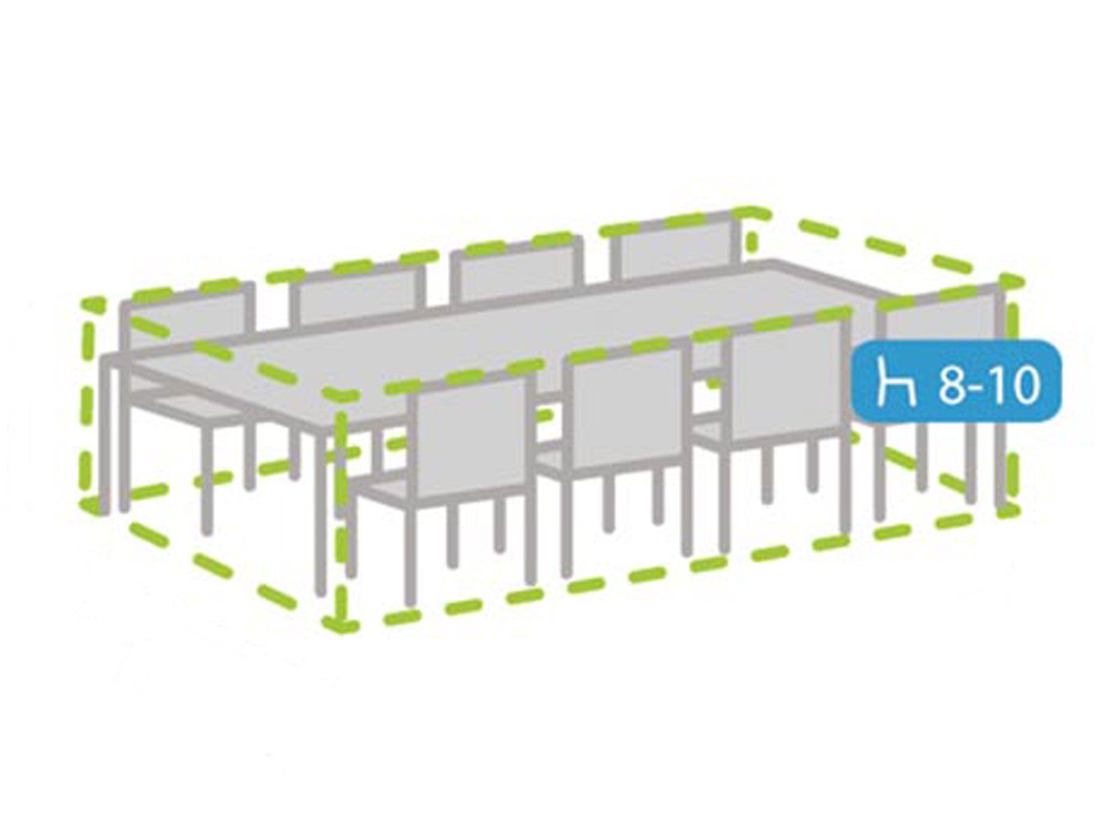 Mit einem Maß von 285 x 180 x 95 cm (LxBxH) eignet sich diese Abdeckung optimal für einen Gartentisch mit 8-10 Stühlen.