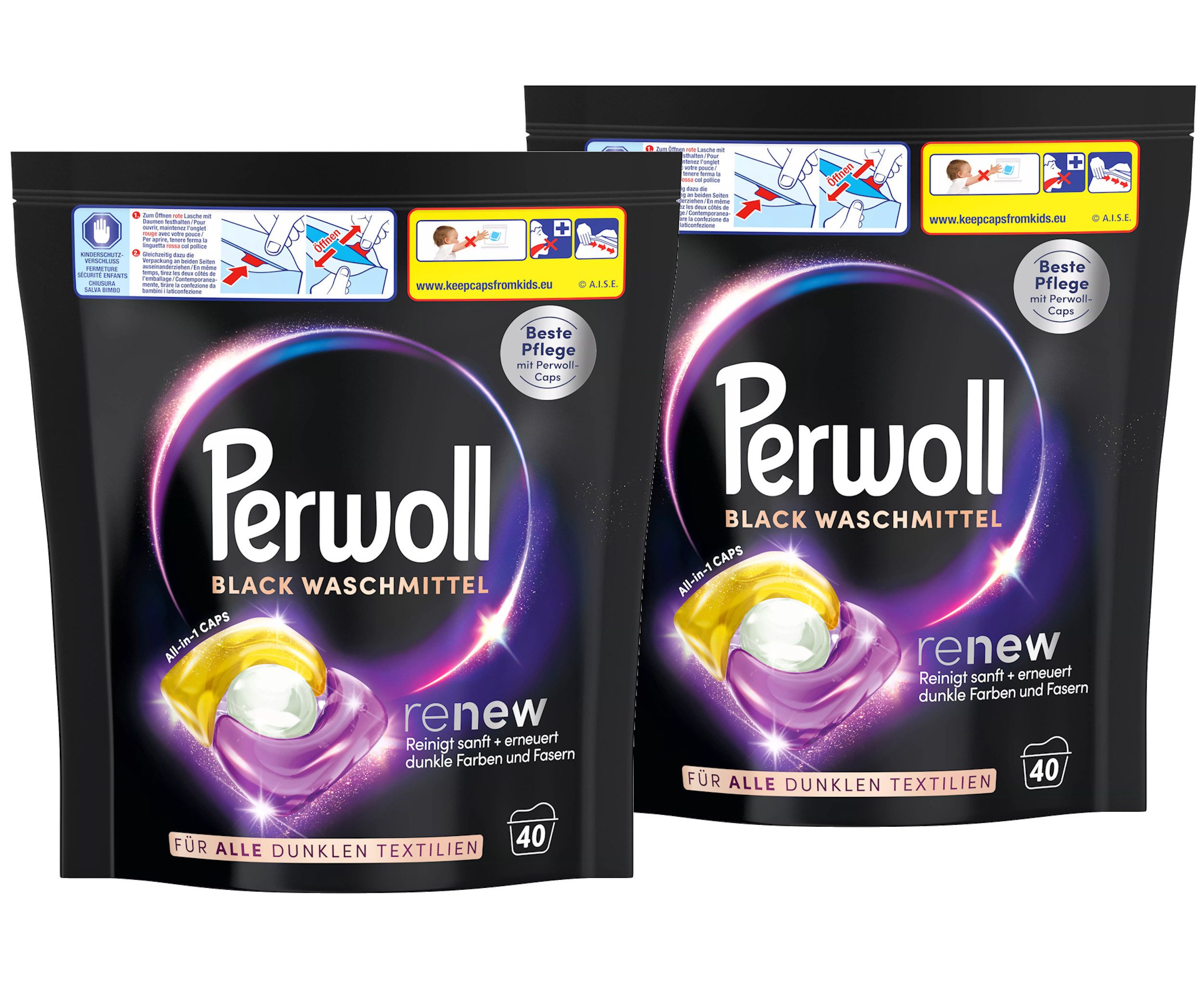 PERWOLL Black Caps – Für die Lieblingskleidung nur die beste Pflege PERWOLL Black Caps – die ideale Pflege für dunkle und schwarze Lieblingskleidung und einfach anzuwenden! Das vordosierte Gelwaschmittel mit Dreifach-Renew-Technologie sorgt nicht nur für sanfte Reinheit und einen frischen Duft, sondern belebt Farben und erneuert Fasern für intensiv dunkle Farben und ein besonders glattes Gefühl – für Kleidung, die sich anfühlt, duftet und aussieht wie neu. Das sanfte Waschmittel kann bei niedrigen und hohen Wassertemperaturen, Standard- und Spezialwaschprogrammen, sowie für die Handwäsche verwendet werden. Die Waschmaschinen Tabs eignen sich für die Anwendung bei einer Vielzahl von Textilien, inklusive Feinwäsche. Dabei ist das Waschmittel nicht nur gut für die Kleidung, sondern auch schonend für den Planeten: Die Formel enthält >95 % biologisch abbaubare Inhaltsstoffe, während die Verpackung aus 50 % recyceltem Plastik besteht und vollständig recycelbar ist**. Die Caps enthalten zudem 85 % weniger Wasser als Flüssigwaschmittel, sind somit 3x ergiebiger* und die Hülle ist zu 100 % wasserlöslich sowie vollständig biologisch abbaubar***. Produktvorteile im Detail: Belebt dunkle Farben Erneuert Fasern Reinigt sanft Frischer Duft Für hohe und niedrige Wassertemperaturen Formel enthält >95 % biologisch abbaubare Inhaltsstoffe Verpackung aus 50 % recyceltem Plastik & 100 % recycelbar** 85 % weniger Wasser als Flüssigwaschmittel* Hülle zu 100 % wasserlöslich sowie vollständig biologisch abbaubar*** Anwendung: Einfach einen Cap in der leeren Wäschetrommel platzieren. Wäsche darauflegen und den Waschzyklus starten Die Marke Perwoll Ist der neu? – Nein mit PERWOLL gewaschen. Der bekannte Slogan wurde bereits vor 30 Jahren zum ersten Mal verwendet und ist zum Markenzeichen geworden. Heute ist PERWOLL vielmehr als ein Spezialist für Wolltextilien: Mit aktuellen Varianten für bunte, weiße oder dunkle Farben und innovativen Konzepten wie der Aktiv-Pflege gegen unangenehme Gerüche in Sporttextilien bietet PERWOLL ein weit gefächertes Angebot und bietet optimale Pflege für Textilien, die einer besonderen Pflege bedürfen. * vs. PERWOLL Color Flüssigwaschmittel, gemäß Henkel Labortests (Deutschland, 2020) ** Ohne Etikett *** Gemäß Henkel Labortests (Deutschland, 2020)