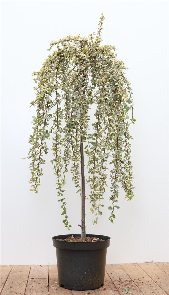 Cotoneaster dammeri ‘Juliette’, die immergrüne Zwergmispel, präsentiert sich hier als charmantes Stämmchen mit elegant überhängender Krone – ein kompaktes Formgehölz, das jeden Garten als Zierstrauch aufwertet. Die feinen, glänzend dunkelgrünen Blätter bleiben ganzjährig attraktiv und setzen die reinweißen, zart duftenden Blüten im späten Frühjahr, meist von Mai bis Juni, wirkungsvoll in Szene. Im Anschluss erscheinen zahlreiche leuchtend rote Beeren, die bis in den Winter haften und einen starken farbigen Akzent bilden. Der Wuchs ist dicht, gleichmäßig und leicht überhängend, wodurch eine weiche, polsterartige Krone entsteht, die als Solitär im Vorgarten ebenso überzeugt wie in Gruppenpflanzungen im Beet oder als stilvolle Kübelpflanze auf Terrasse und Balkon. ‘Juliette’ bevorzugt einen sonnigen bis halbschattigen Standort und gedeiht in durchlässigen, eher nährstoffarmen bis mäßig nährstoffreichen Gartenböden, gern mit leichtem Kalkanteil. Staunässe sollte vermieden werden; kurze Trockenphasen nach dem Anwachsen werden gut toleriert. Dank ausgeprägter Schnittverträglichkeit bleibt die Krone formstabil und lässt sich leicht kompakt halten oder sanft auslichten. Als pflegeleichter Gartenstrauch fügt sich die Zwergmispel ideal in moderne Gestaltungskonzepte ein, rahmt Eingangsbereiche, Treppen und Sitzplätze und sorgt auf kleinen Flächen für Struktur. In Kombination mit Gräsern, Lavendel oder Stauden mit silbrigem Laub entstehen harmonische Kontraste, während die ganzjährige Belaubung zuverlässig für eine gepflegte Optik sorgt. Ein vielseitiger Blütenstrauch, der langfristig Struktur, Farbe und elegantes Grün in Außenräume bringt.
