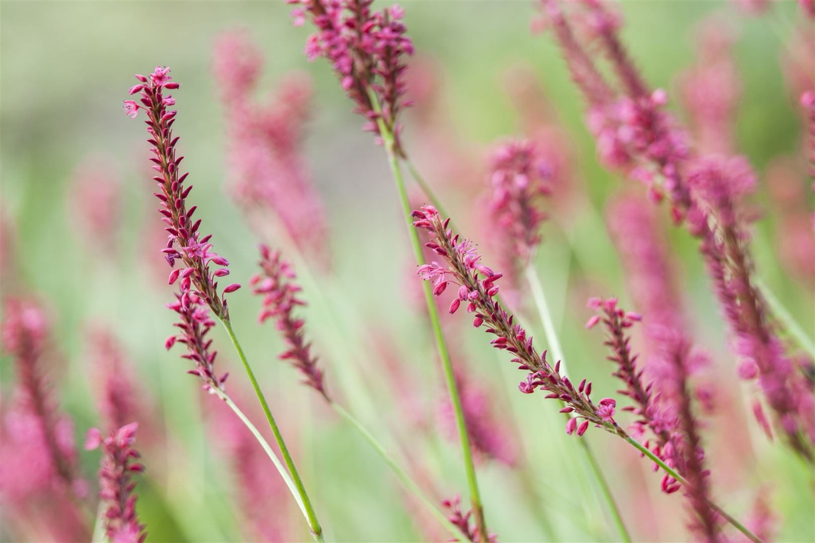 Bistorta amplexicaulis ‘Inverleith’, der kompakte Kerzenknöterich, ist eine attraktive Blütenstaude für vielfältige Gartensituationen. Diese Auslese überzeugt mit leuchtend purpurrosaroten bis kirschroten Blütenähren, die von Juni bis in den Oktober hinein über dem frischen, lanzettlichen Laub schweben. Der Wuchs bleibt bei ‘Inverleith’ angenehm niedrig und horstbildend, wodurch die Pflanze eine dichte, buschige Struktur entwickelt und als Beetstaude ebenso wirkt wie als flächige Begleiterin im Staudenbeet. Die aufrechten, schlanken Blütenkerzen setzen rhythmische Akzente, während das sattgrüne Laub den Pflanzungen Ruhe und Fülle verleiht. Als vielseitige Gartenstaude passt der Kerzenknöterich hervorragend an den Beetrand, in Präriebeete, Natur- und Bauerngärten sowie an leicht feuchte Standorte wie den Teich- oder Bachlaufsaum. In der Gruppenpflanzung schafft er harmonische Teppiche, als niedriger Solitär im Vordergrund strukturiert er Rabatten und Vorgärten. Auch im größeren Kübel auf Terrasse oder Balkon zeigt sich ‘Inverleith’ zuverlässig und dekorativ. Ideal ist ein sonniger bis halbschattiger Platz mit frischem, humosem, nährstoffreichem Boden; gleichmäßige Bodenfeuchte fördert die lange Blüte, Staunässe wird jedoch vermieden. Ein Rückschnitt verblühter Ähren regt die Nachblüte an, im Spätwinter kann das Laub bodennah eingekürzt werden. Die Staude lässt sich im Frühjahr oder Herbst problemlos teilen, um Bestände zu verjüngen oder zu erweitern. In Kombination mit Ziergräsern, herbstblühenden Astern, Purpursonnenhut oder Sonnenbraut entstehen dauerhaft ansprechende, pflegeleichte Pflanzbilder mit feiner Textur und lebendigem Farbspiel.