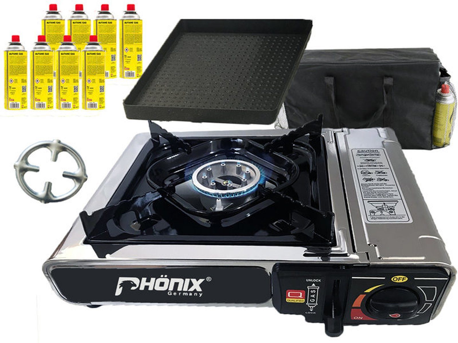 | Lieferumfang | Gaskocher PC20, 8x Gaskartuschen, Tasche, Herdkreuz, Grillplatte 25cm |