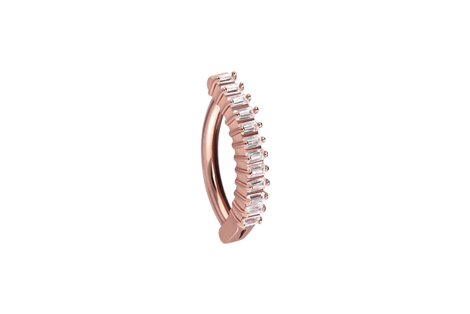 Einfache Handhabung und schönes Design - das sind unsere Clicker! Als Hauptmerkmal der Clicker zählt das praktische Scharnier, das den Einsatz in den Stichkanal enorm erleichtert. Das zur Herstellung verwendete Material (Titan Grad 23) zeichnet sich insbesondere durch gute Hautverträglichkeit, hochwertige Qualität und hohe Beständigkeit aus. Je nach Farbwunsch ist das Piercing mit einer kratzfesten PVD-Beschichtung überzogen. Ebenso schlicht wie elegant ist der mit Kristallrechtecken besetzte Bogen, der das Design ausmacht. Dieser Bauchnabelclicker verfügt über eine Stabstärke von 1,6 mm und eine Stablänge von 10 mm.