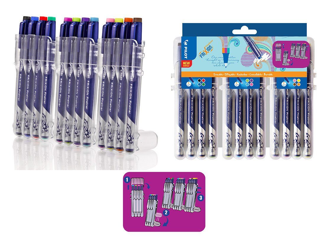 Der innovative FriXion Fineliner ist radierbar und verfügt über eine robuste sowie sehr bruch- und druckresistente Polyester-Faserspitze. Demnach ist er perfekt geeignet fürs Schreiben, Scribbeln, Mandala, Bullet Journaling, Zeichnen und Skizzieren. Er ist ausgestattet mit der patentierten, thermosensitiven FriXion-Tinte. Mittels der Kunststoffspitze am Kappenkopf und der erzeugten Reibungswärme (ab ca. 60° C) kann das Geschriebene weggerieben werden. Kälte bewirkt den Umkehreffekt. Eine kurze Zeit im Gefrierfach (ab ca. -10° C) lässt die Schrift wieder erscheinen. Schreibspitze: M = 1,3 mm. Strichbreite: ca. 0,45 mm. Kunststoffspitze am Kappenkopf = Schreibfarbe. Schreibfarben: Schwarz, Rot, Blau, Grün, Gelb, Orange, Braun, Violett, Pink, Hellblau, Hellgrün und Babypink. Nicht dokumentenecht.