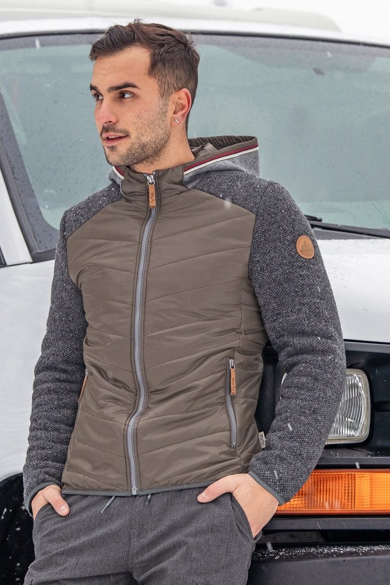 Teublitz, die fantastische, winddichte sowie wasserabweisende Hybrid-Steppjacke für Herren von der Marke Piz Palü, ist so leicht und bequem, dass sie wie eine zweite Haut sitzt und kaum zu spüren ist. Für den optimalen Wärmehalt - auch bei nassem Wetter - sorgt die nachhaltige, angenehme Primaloft Wattierung bei den gesteppten Bereichen. Die Kapuze aus hellgrauem, leicht gewalktem Material mit dezenter Webstruktur hat ein oliv-farbenes Futter aus Steppmaterial, das außen als Saum sichtbar ist, und außen eine stylische, dreifarbige Stoffborte. Der integrierte Stehkragen vorn schützt zudem gut vor kaltem Wind. Sowohl die Vorder- als auch die Rückseite der leichtgewichtigen, angesagten Herrenjacke bestehen aus oliv-farbenem Steppmaterial mit leicht v-förmigen Quernähten. Der Schulterbereich und die Ärmel sind in Perlstrick-Art in Dunkelgrau gefertigt und elastisch. Den Frontreißverschluss und die Reißverschlüsse der Eingrifftaschen beidseitig längs zieren Anhänger im Leder-Look mit Markenname und auf dem linken Ärmel ist ein runder Marken-Patch im Leder-Stil mit Markenlogo angebracht. Die Bündchen und der Jackenabschluss sind elastisch umsäumt. Komplettiert wird die Herren Steppjacke durch die Innentasche links mit dem Reißverschluss längs neben dem Frontreißverschluss. Die fesche, ultraweiche Jacke im Material- und Muster-Mix ist komprimierbar, ein toller Begleiter bei Outdoor-Aktivitäten und lässt sich auch mega zu Lederhose und Trachtenjeans kombinieren. Bitte beachten Sie den Größenzuschlag ab Größe 58.