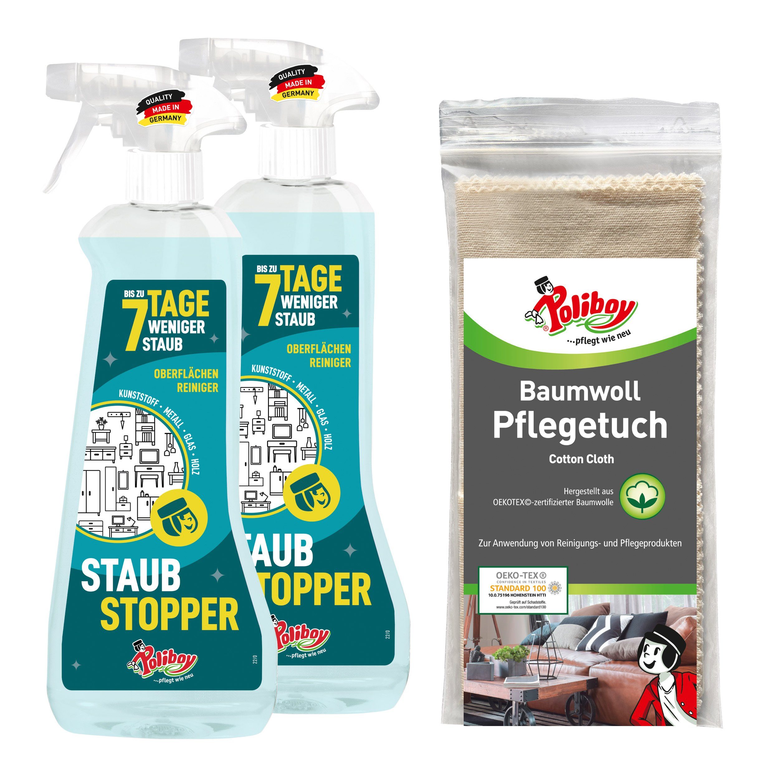 Der POLIBOY Staubstopper ist das ideale Produkt für Wohlfühlräume. Er reinigt nicht nur Kunststoff, Metall, Glas und versiegeltes Holz, sondern reduziert auch die Ablagerungen von Staub auf deinen Möbeln. Neben streifenfreier Sauberkeit sorgt der Staubstopper außerdem mit frischem Duft für einen angenehmen Raumduft. Der POLIBOY Staubstopper ist ein Allroundtalent für alle glatten Oberflächen und eignet sich daher für alle staubempfindlichen Einrichtungen in Wohn- und Schlafzimmer sowie in Küche und Bad. Er beseitigt mühelos störenden Staub, fettige Fingerabdrücke und andere Verschmutzungen. Weniger putzen – mehr Entspannen und das mit gutem Gefühl. Der Staubstopper ist ein veganes Produkt in einer Flasche zu 100% aus widerverwendetem Kunststoff.