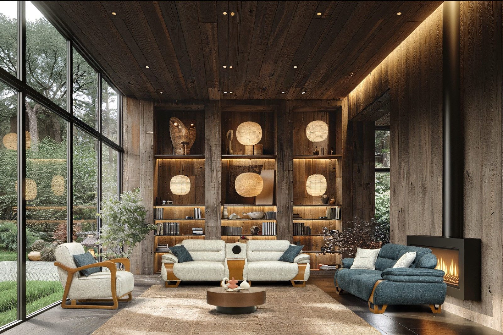 Dieses elegante Polstermöbel-Set, bestehend aus einem großzügigen 2+2-Sitzer Sofa und einem komfortablen Bergère Sessel, schafft eine warme und moderne Atmosphäre in Ihrem Wohnzimmer. Inspiriert vom gemütlichen, naturnahen Stil, fügt sich das Set perfekt in helle, holzbetonte Interieurs ein, wie es das dargestellte Ambiente mit raumhohen Fenstern und Holzwänden zeigt.
