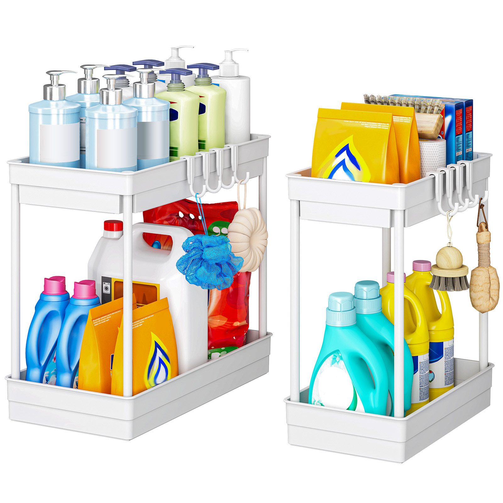 Dieses multifunktionale, doppelstöckige Aufbewahrungsregal optimiert den Platzbedarf und ist mit 8 praktischen Haken und einer Abtropfschale ausgestattet, um den unterschiedlichsten Aufbewahrungsbedürfnissen in Küchen, Badezimmern und Büros gerecht zu werden! Flexible Doppelspezifikationen: Groß/Klein sind optional erhältlich, um unterschiedlichen Platzanforderungen gerecht zu werden. Dreidimensionales Aufbewahrungssystem: Doppelstöckiges Design + 8 Haken. Gewürzflaschen, Toilettenartikel und Büroutensilien werden sortiert aufbewahrt. Durchdachtes, funktionales Design: Hohler Bodenablauf hält die Arbeitsplatte trocken; Haken zum Aufhängen von Reinigungswerkzeugen, Küchenutensilien usw. Vielseitig einsetzbar: Unter der Küchenspüle, der Badezimmerarbeitsplatte oder in der Büroecke – für optimale Raumnutzung. Stabil und langlebig: Hochwertiger Kunststoff, hohe Tragkraft, glatte Kanten, sicher und schonend für die Hände.