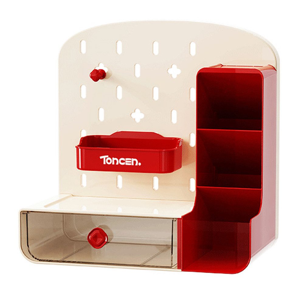 Diese cremefarbene und rote Schreibtisch-Aufbewahrungsbox besticht durch ihr schlichtes und stilvolles Design, das Funktionalität und Ästhetik vereint. Die mit Löchern versehene Rückwand eignet sich zum Aufhängen kleiner Gegenstände für einen einfachen Zugriff. Die rote Aufbewahrungsbox in der Mitte eignet sich zur Aufbewahrung häufig verwendeter Schreibwaren. Die transparente Schublade darunter ist auf einen Blick übersichtlich und eignet sich ideal für die Aufbewahrung verstreuter Gegenstände. Das mehrschichtige rote Aufbewahrungsgitter auf der rechten Seite dient zum Sortieren von Schreibwaren, kleinen Werkzeugen usw. und sorgt für einen sauberen und ordentlichen Schreibtisch. Ob im Büro, im Arbeitszimmer oder zu Hause – sie verbessert die Raumnutzung und schafft eine effiziente und komfortable Schreibtischumgebung.