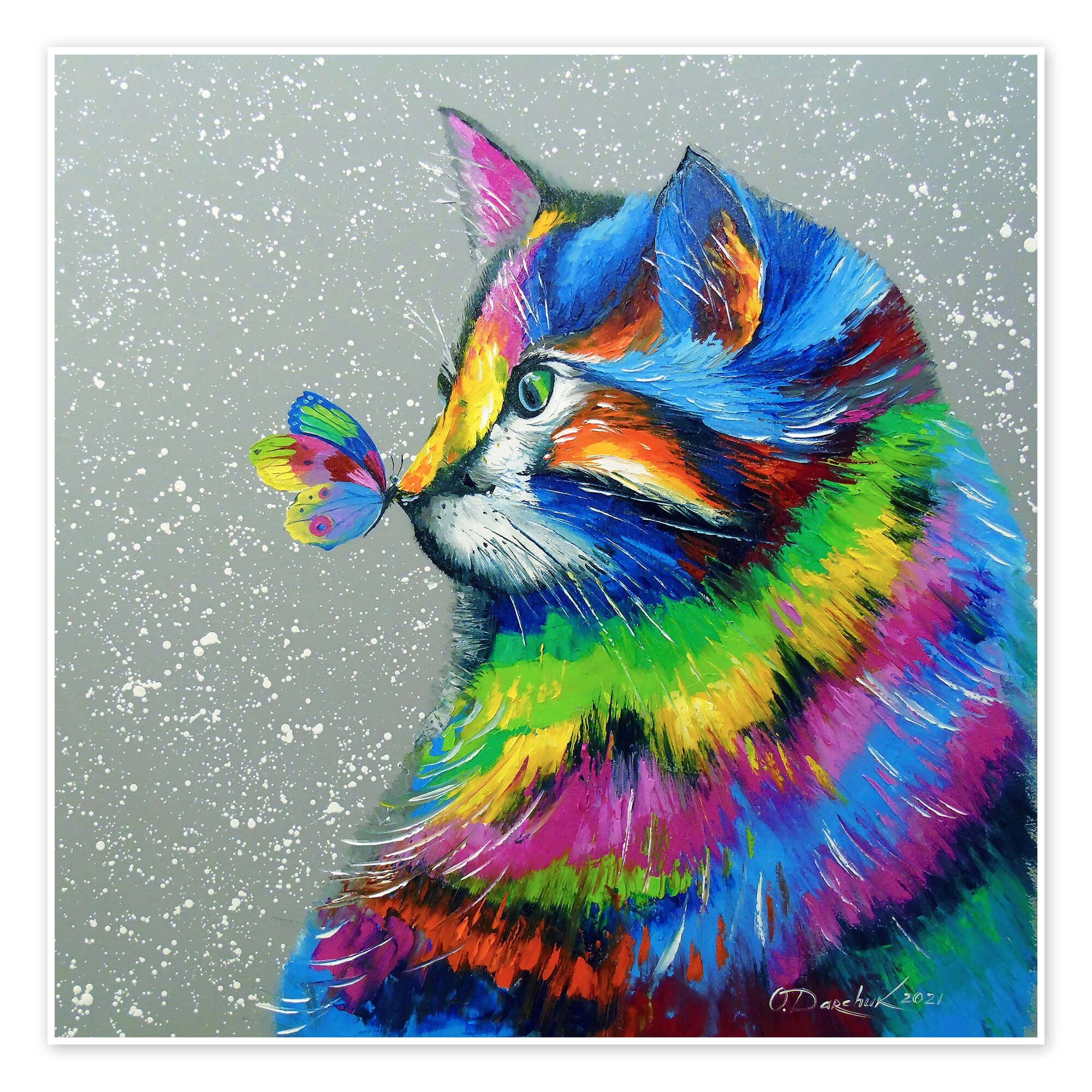Das Poster „Helle Katze und Schmetterling“ (738897) aus dem Sortiment des Kunstverlags Posterlounge wird Sie mit intensiven Farben und hervorragender Kunstdruck-Qualität begeistern. Der hochwertige, leicht glänzende Druck auf kräftigem Premiumpapier (250 g/m²) macht das Bild von Olha Darchuk zu einem echten Hingucker für Ihr Zuhause. Durch den 3 mm breiten weißen Rand, der in allen Formaten inbegriffen ist, wird das Motiv hervorgehoben und wirkt besonders edel.