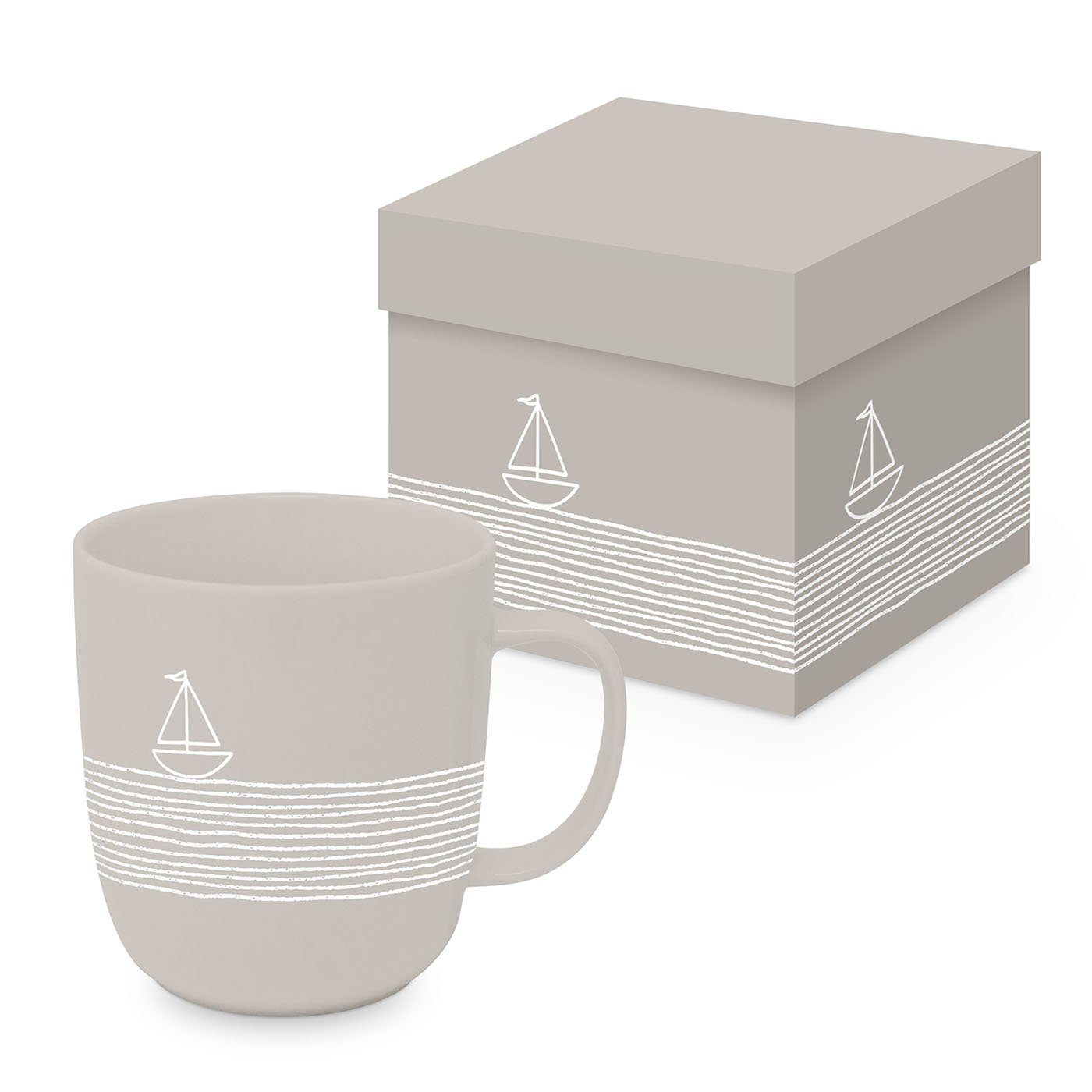 Das Design des Bechers zeigt ein weißes Boot auf dem Meer, das in einen beigen, matten Hintergrund eingebettet ist. Der Look ist dadurch sehr maritim und erinnert an den Ozean und das Meer. Die Farben sind sehr harmonisch aufeinander abgestimmt und verleihen dem Becher ein ansprechendes Aussehen. Sie erhalten den Porzellanbecher in einem Geschenkkarton und somit ist dieser auch ideal zum Verschenken geeignet.