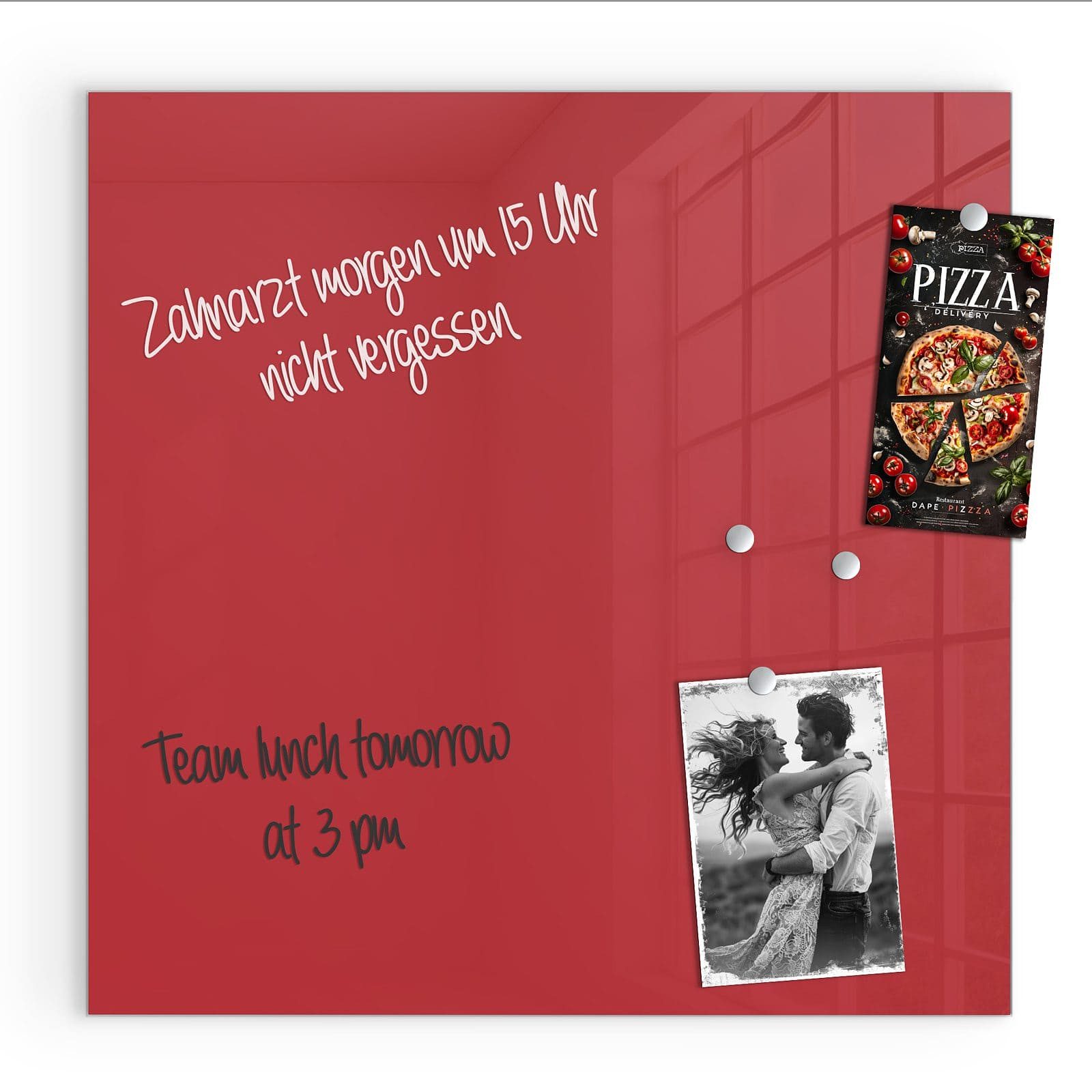 .| Ausstattung | Enthält 2 Neodym-Magnete, 1 Stift, 1 Reinigungstuch; magnetisch haftend, beschreibbar, aus 4 mm starkem Sicherheitsglas (ESG) |