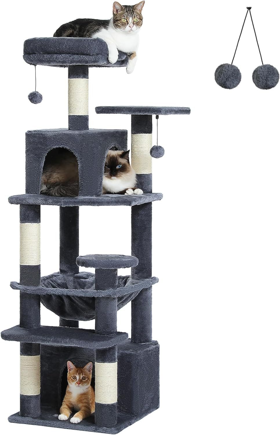 Ich habe eine Kleine und eine ausgewachsene Katze. Für die Kleine ist der Kratzbaum perfekt, für die Grosse zwar auch, aber für die Höhlen wird es schon ein wenig eng. Es word sich zwar trotzdem reingequetscht, aber nir für einen kurzen Moment. Die Hängematte ist für die Grosse der Lieblingsplatz geworden und die Kleine liegt immer ganz oben. Material ist ok, für den Preis kann man aber nicht meckern. Hat eine gute Stabilität und wenn man möchte kann man ihn an einer Wand befestigen.