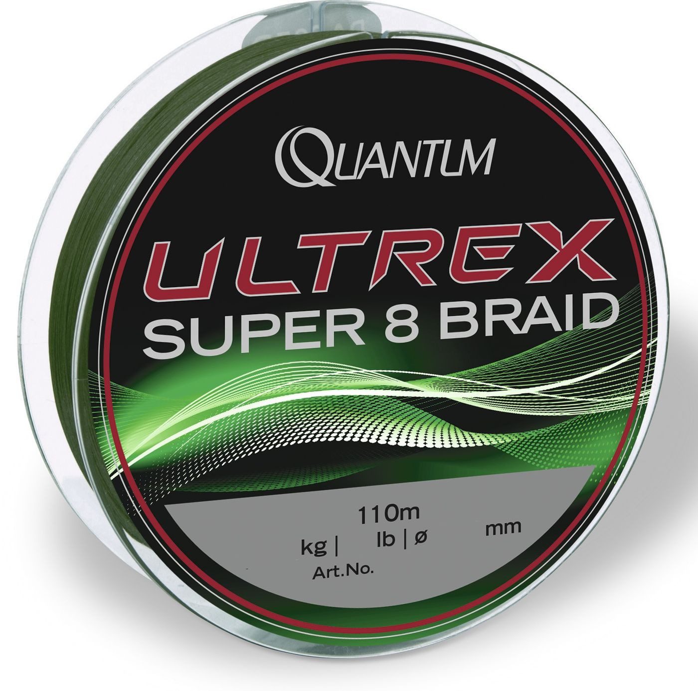 Quantum Ultrex Super 8 Braid geflochtene Schnur grün - Die Angelschnur von Quantum ist eine Geflechtschnur, die sehr gute Leistungen beim Spinnfischen auf Hecht, Zander und Barsch sowie beim Meeresangeln, wie beispielsweise Brandungsangeln, bietet. Die 8fache Flechtung des Rohmaterials macht die Angelschnur rund und zudem sehr leise in den Rutenringen beim Werfen und Einkurbeln. Die Dehnungswerte sind reduziert, wodurch der Angler einen direkten Kontakt zum Kunstköder hält, wodurch eine sehr gute Köderführung, Köderkontrolle und Bisserkennung ermöglicht wird. Weiterhin besteht im Drill ein direkter Kontakt zum Gegner und durch die guten Tragkraftwerte kann die Ultrex Schnur auch kapitalen sowie starken Fischen Paroli bieten.
