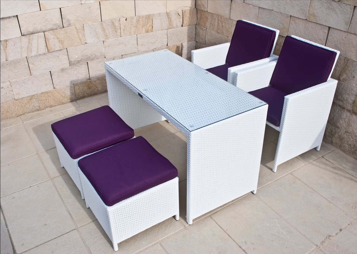 | Set beinhaltet | 1 Tisch inkl. Sicherheitsglasplatte, 2 Sessel, 2 Hocker, 6 Polster |