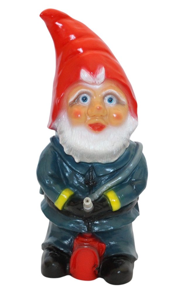 Produkt: Dekofigur Wasserspeier Gartenzwerg Feuerwehrmann stehend mit Löschschlauch in den Händen und Feuerlöscher zwischen den Beinen Gartenfigur Gartendeko für Außen- und Innenbereiche ohne Pumpe.