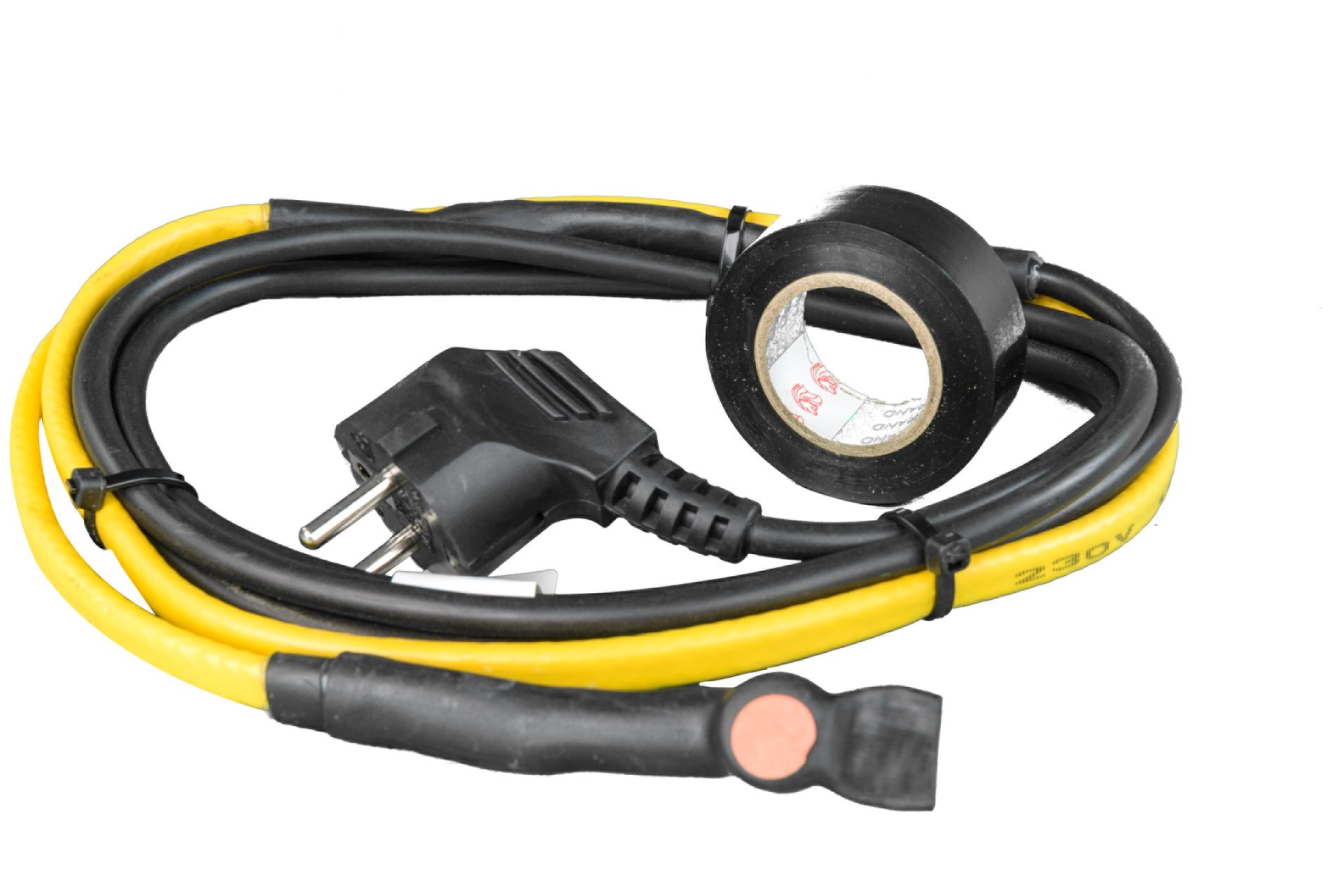 Das zwei Meter lange Anschlusskabel ist passend für jede Einsatzsituation: das gelbe Flachbandkabel wird ganz einfach um die äußere Rohrleitung gewickelt und mit einem Aluminiumband oder auch Kabelbindern befestigt.