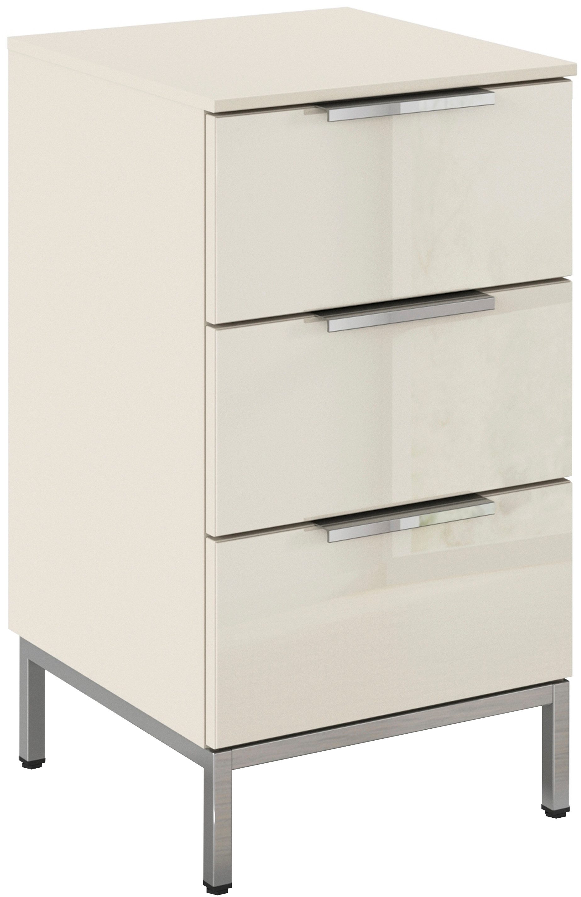 Mehr als nur ein funktionales Möbelstück: Der Nachttisch »FLIPP« von rauch ist eine stilvolle Ergänzung für jedes Schlafzimmer. Um individuellen Wünschen gerecht zu werden, hast du die Wahl zwischen verschiedenen Farbkombinationen - darunter auch die wohnlich warme Nuance Beige. Ein Highlight des Nachttisches ist die Front mit Glasauflage, die dem Möbelstück einen Hauch von Eleganz verleiht und ganz luftig und leicht wirkt. Das schlichte Design wird durch die farblich passenden Griffe stilvoll abgerundet. Für eine zeitlose Optik sorgt das Fußgestell aus Metall, das dem Nachttisch einen besonders filigranen Auftritt verleiht. Mit drei geräumigen Schubkästen bietet er dir großzügigen Stauraum, um all deine nächtlichen Necessaires ordentlich zu verstauen. Dabei sind die Schubkästen mit Selbsteinzug und Dämpfung ausgestattet, was ein leises und sanftes Schließen ermöglicht, ohne den Schlaf deines Partners zu stören.