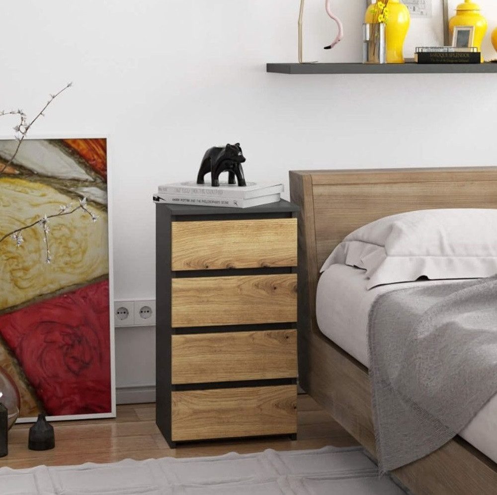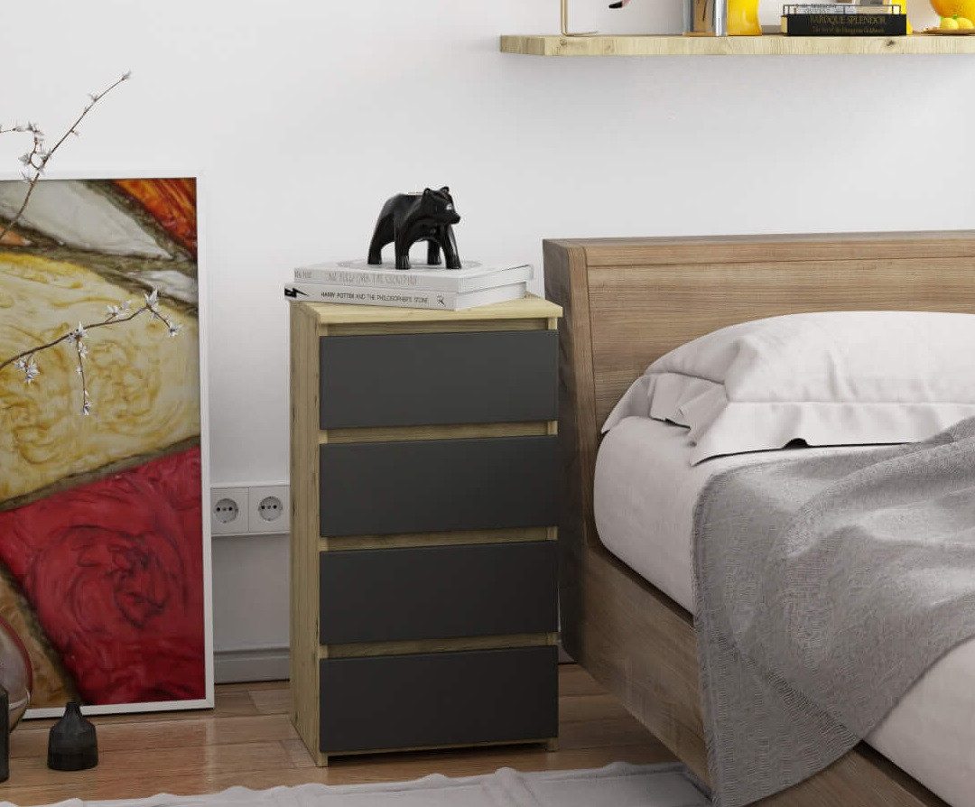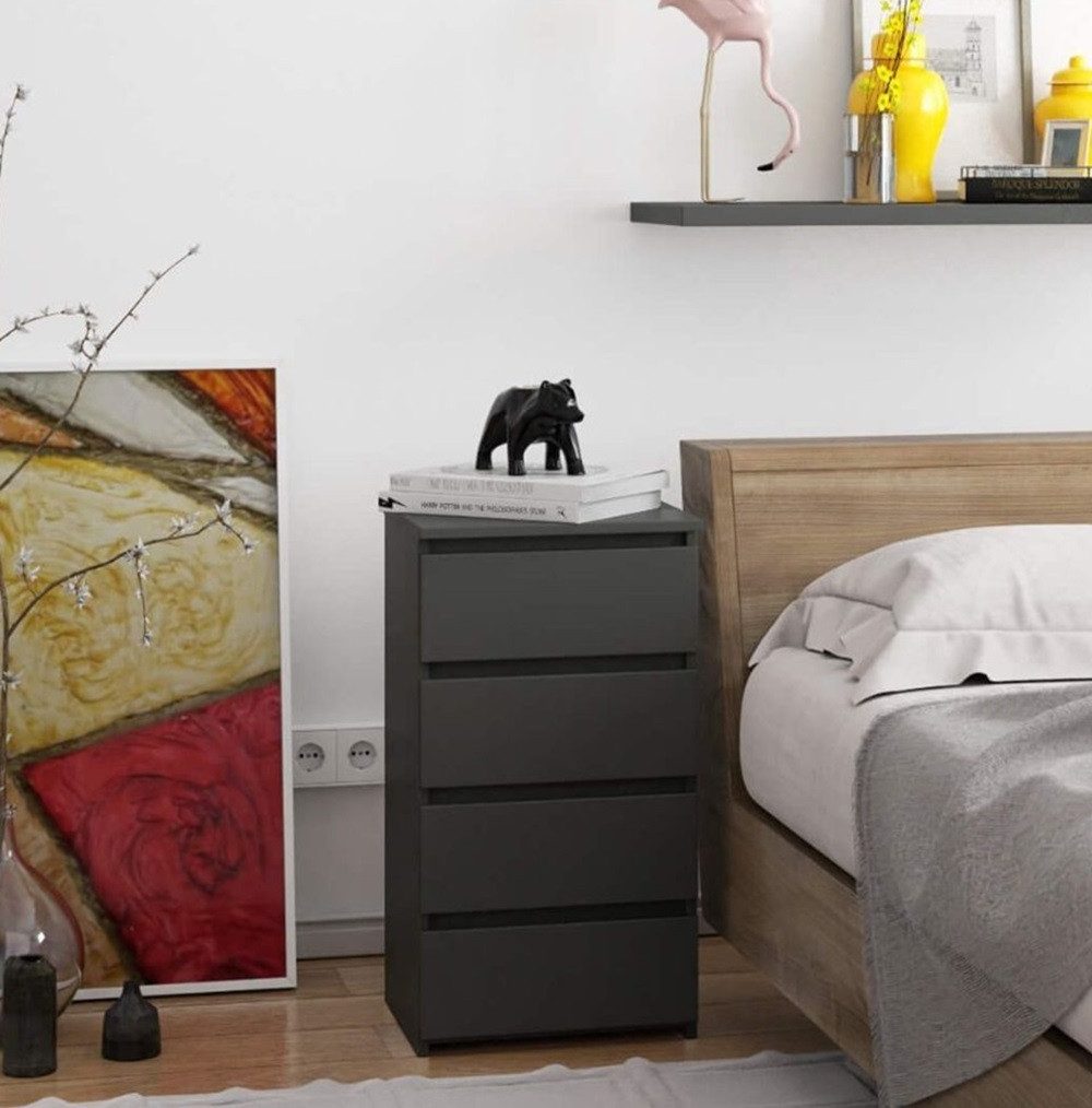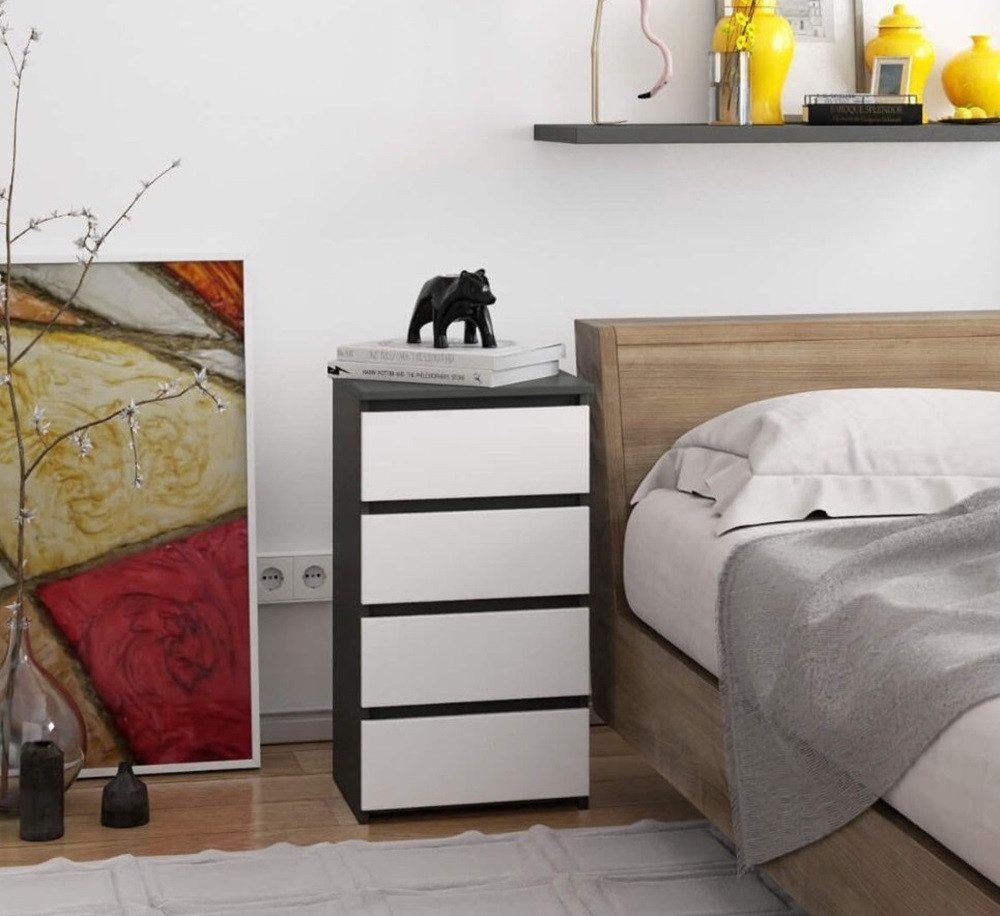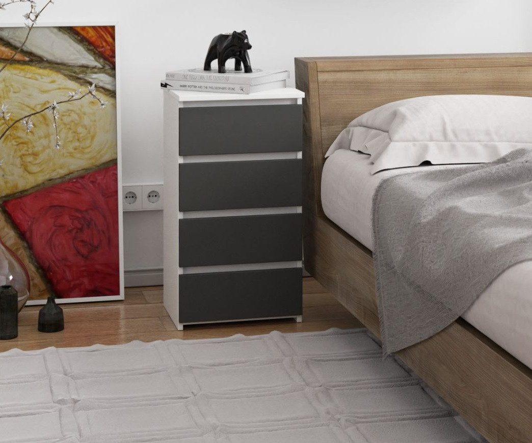 Im Inneren finden sich vier geräumige Schubladen, die sich perfekt für die Aufbewahrung von Kleidung, Unterlagen oder anderen persönlichen Gegenständen eignen. Die hochwertigen Metall-Rollführungen sorgen dafür, dass die Schubladen sanft und problemlos bedient werden können. Zudem ermöglicht das integrierte Soft-Close-System ein leises Schließen, wodurch störende Geräusche vermieden werden.