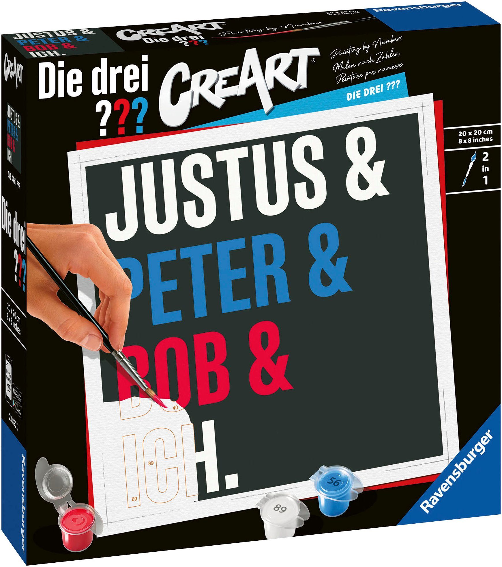 Coole Motive, leuchtende Farben und glänzender Lack für ein perfektes Finish. Das trendige Motiv Die drei ??? sorgt für großartigen Malspaß für Erwachsene ab 12 Jahren. Die Motivlinien sind bereits aufgedruckt und nummeriert und werden mit den fertig gemischten Acrylfarben ausgemalt. Das ist Malspaß mit Erfolgsgarantie für einen einzigartigen Wandschmuck. So einfach war malen noch nie! Mit CreArt - Malen nach Zahlen von Ravensburger den Weg zur inneren Ruhe und Entspannung finden. Einfach auspacken und los malen: jedes Malset enthält alles, was zum Malen benötigt wird und es ist kein Mischen der Farben notwendig. Das fertig gemalte Bild eignet sich als trendige Dekoration in jedem Zuhause. Das Ravensburger CreArt - Malen nach Zahlen Programm bietet eine große Motivauswahl für Kinder und Erwachsene.