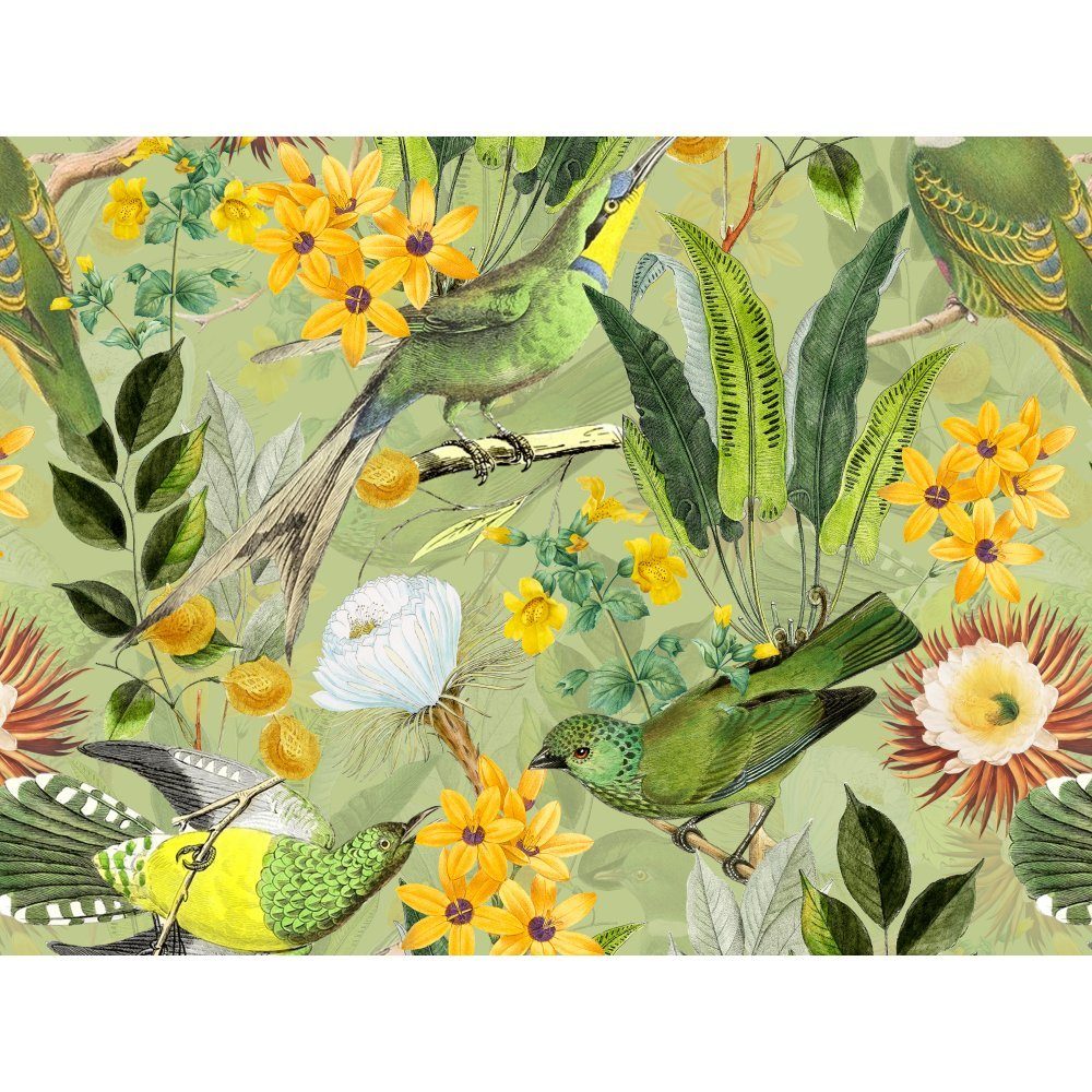 Ein tropisches Vintage-Muster entfaltet eine exotische Pracht, die die Sinne verzaubert. Auf einem luxuriösen grünem Hintergrund blühen üppige, exotische gelbe Blumen in lebendigen Farben und formen einen üppigen Dschungel. Inmitten dieser blühenden Pracht sind exotische Vögel in exquisiten Farben zu sehen, die dem Muster eine majestätische Eleganz verleihen. Dieses kunstvoll gestaltete Design vereint die Schönheit der Natur und die Opulenz vergangener Zeiten und erzeugt eine zeitlose Atmosphäre von Luxus und Exotik. Es ist eine Hommage an die exotische Flora und Fauna, die in einem tropischen Paradies zu Hause ist.
