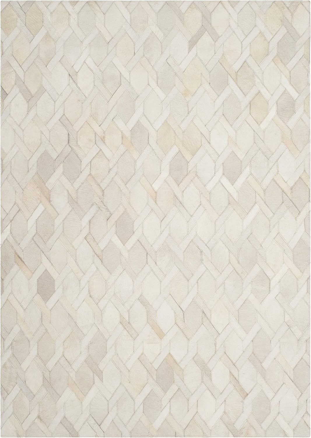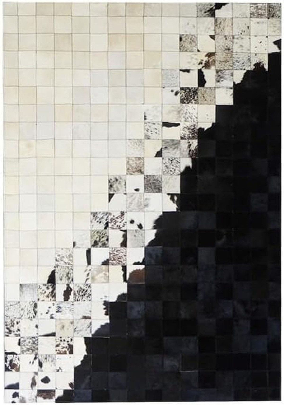 Luxuriöser Teppich mit Mosaikmuster und einer raffinierten Mischung aus weißen und grauen Rindsleder-Stücken, perfekt für eine moderne Wohnraumgestaltung.