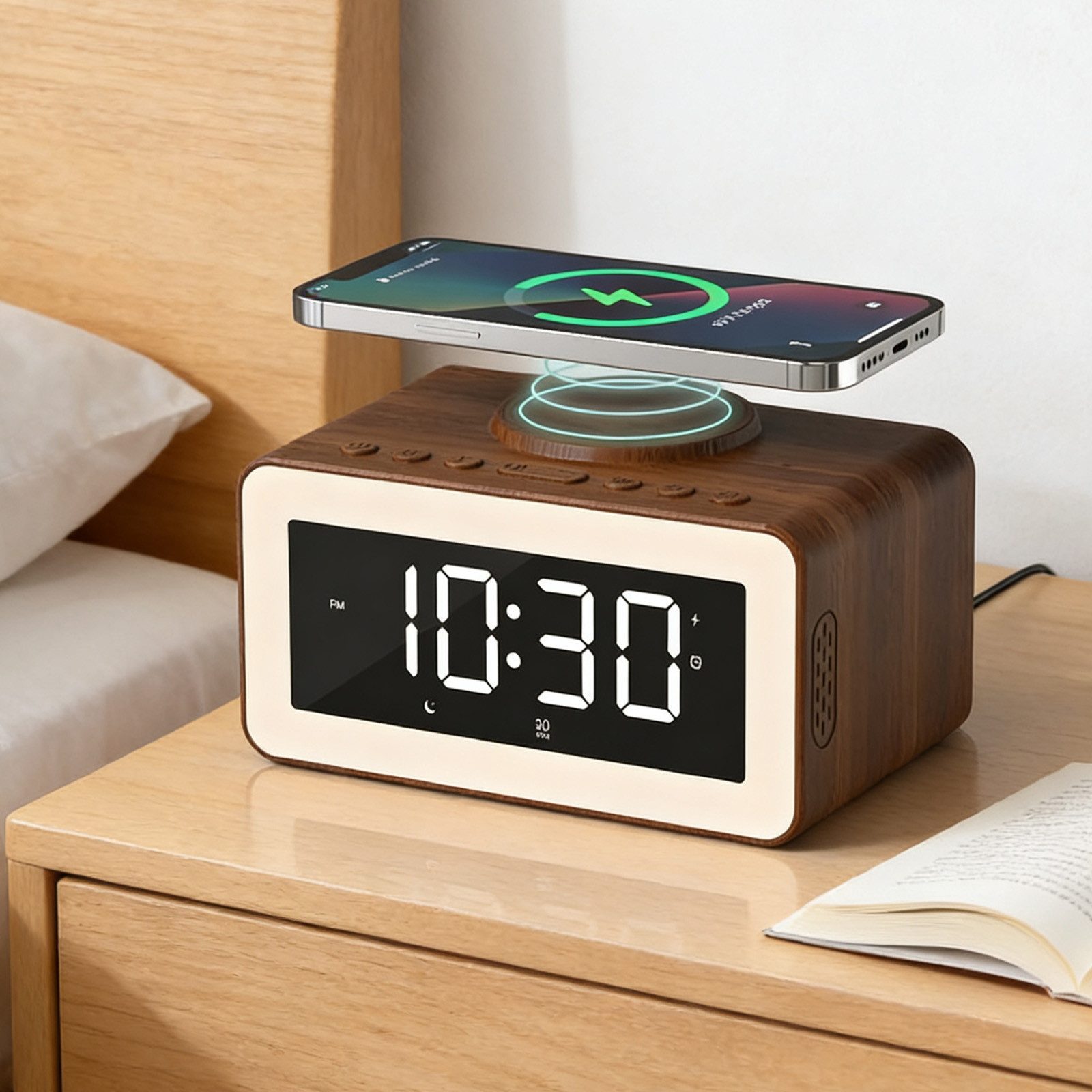 Der Holzwecker verfügt über eine integrierte Ladefläche, die kabelloses Laden für alle Qi-fähigen Smartphones ermöglicht.