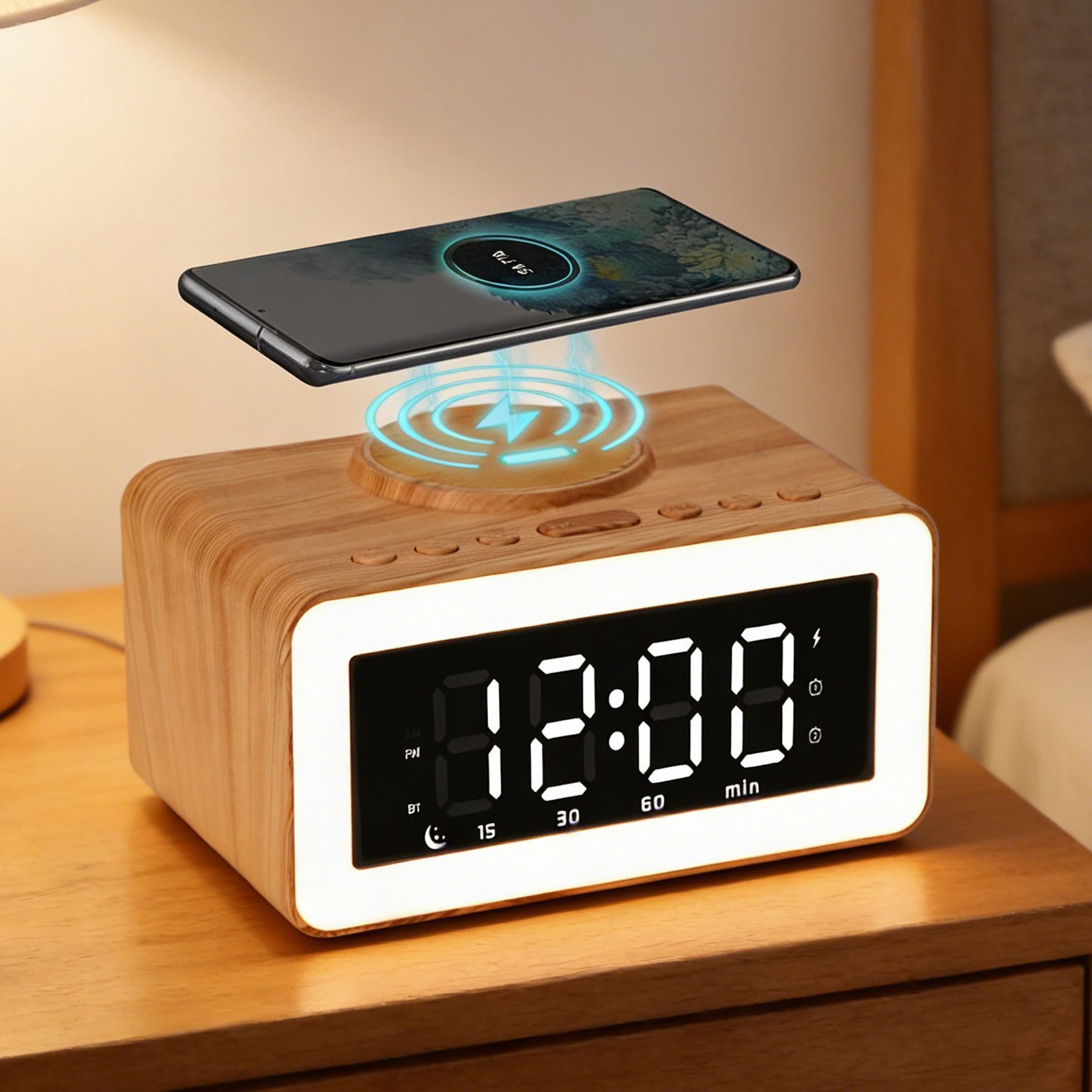 Der REDOM 5-in-1-Holzwecker kombiniert Bluetooth-Lautsprecher, Wecker, kabelloses Ladegerät, Nachtlicht und Weißrausch-Modus in einem ästhetischen Gerät.